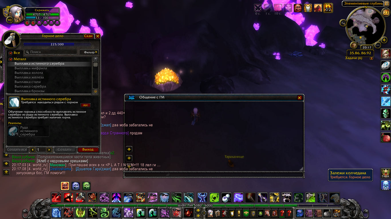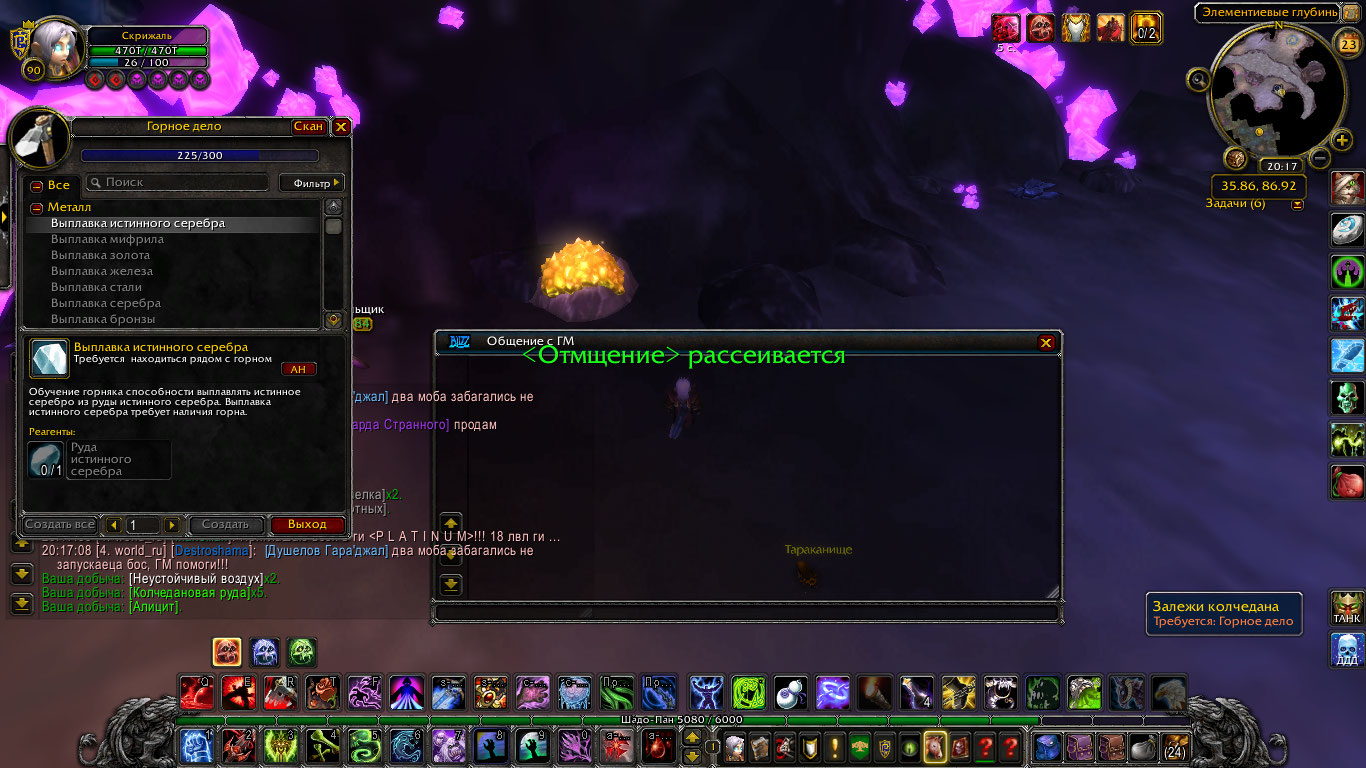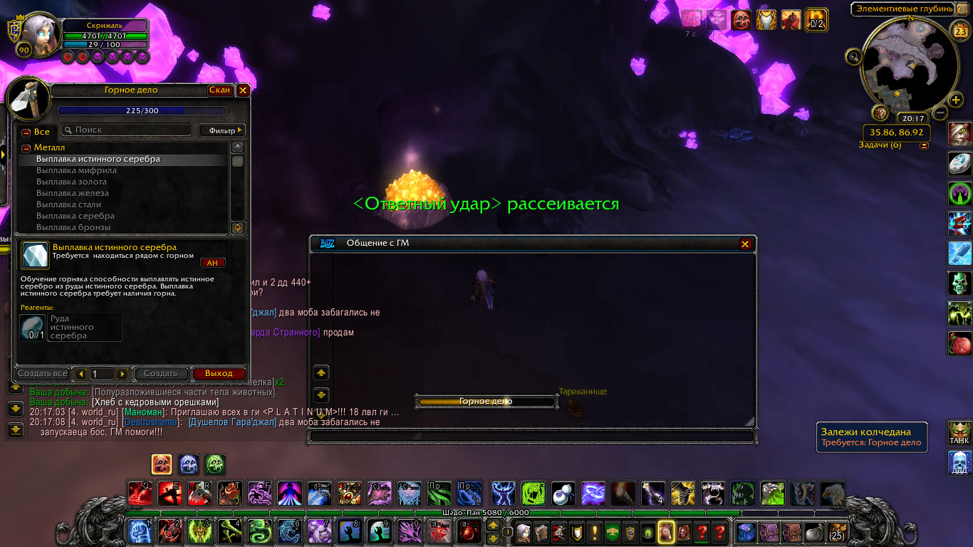 | Description | Здравствуйте! Сообщаю об ошибке в профессии Горное дело. Навык перестал подниматься при выкапывании руды. На прикрепленных скриншотах видно окно профессии в котором выплавка металлов перестала поднимать навык. Также на этих скриншотах я выкапываю колчедановую руду, которая значительно превосходит текущий уровень и гарантированно должна повышать навык, но этого не происходит. Следующая выплавка металлов становится доступна на 230 уровне, в то время как отметка профессии остановилась на 225 и не поднимается дальше. Таким образом не представляется возможным прокачать эту профессию дальше. | ||||