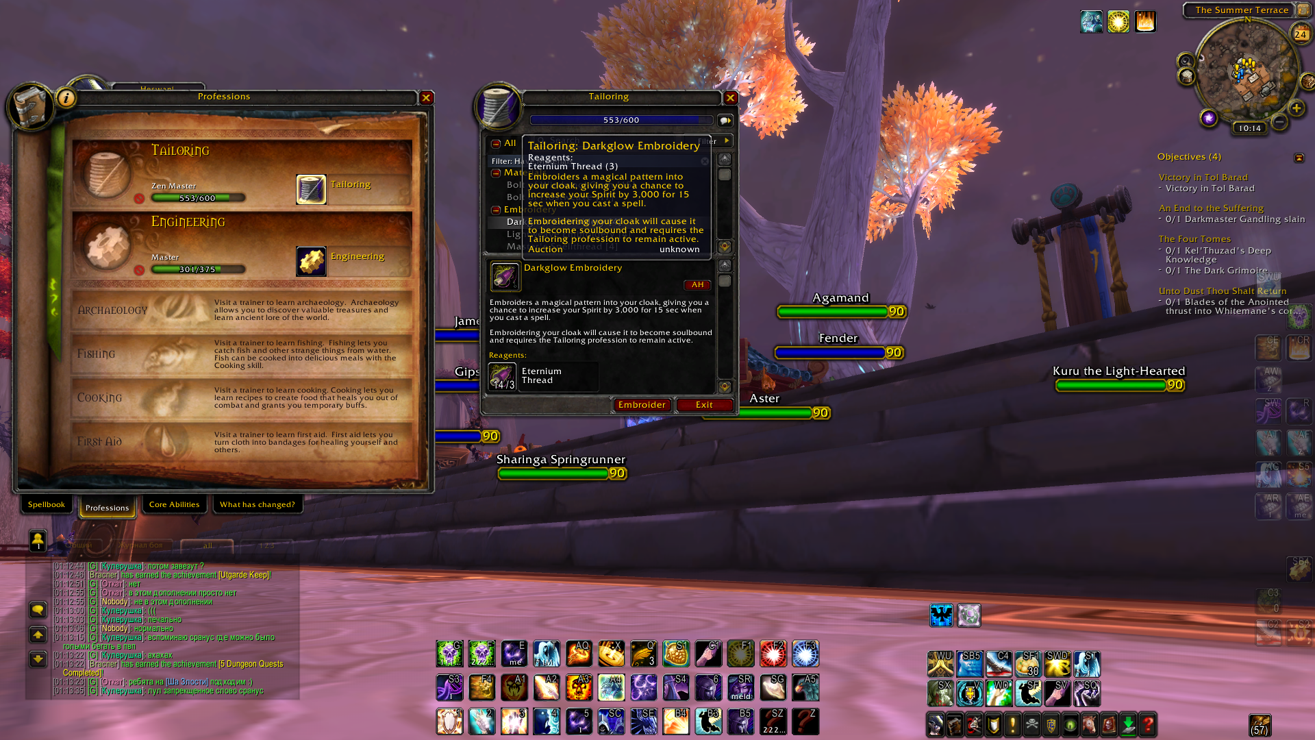 | Additional Information | От тестера: Вышивка в виде рукояти меча [55777] (https://www.wowhead.com/ru/spell=55777) Вышивка темного сияния [55769] (https://www.wowhead.com/ru/spell=55769) Освященная чародейская нить [56039] (https://www.wowhead.com/ru/spell=56039) Светлотканая вышивка [55642] (https://www.wowhead.com/ru/spell=55642) Чародейская нить наставника [56034] (https://www.wowhead.com/ru/spell=56034) Не работает разделение прока от уровня профессии https://docs.google.com/spreadsheets/d/1QMLJ3sKyECFkAbjyjWzFZtMAwnQgfe2_wAtMw1hsfBs/edit#gid=1 | ||||