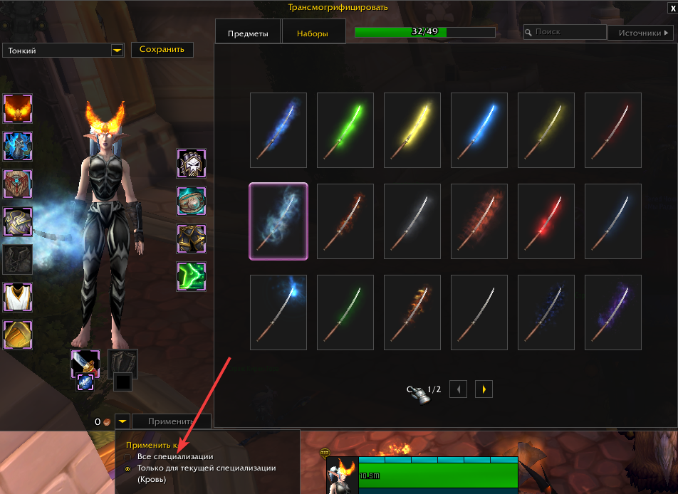 галочка которая у трасмогрификатора или в сетах экипировки? |