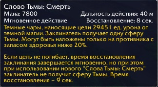 | Description | Обнаружил баг в механике заклинания слово тьмы: смерть у шп пристов. У данного заклинания после 20% хр есть так называемые 2 фазы: 1) наносится урон и генерируется сфера тьмы; 2) если цель не погибает, то можно прожать спел ещё раз, только в этот раз урон наносится, а сфера не генерируется. При 1 прожатии сферы у нас не генерируются. | ||||