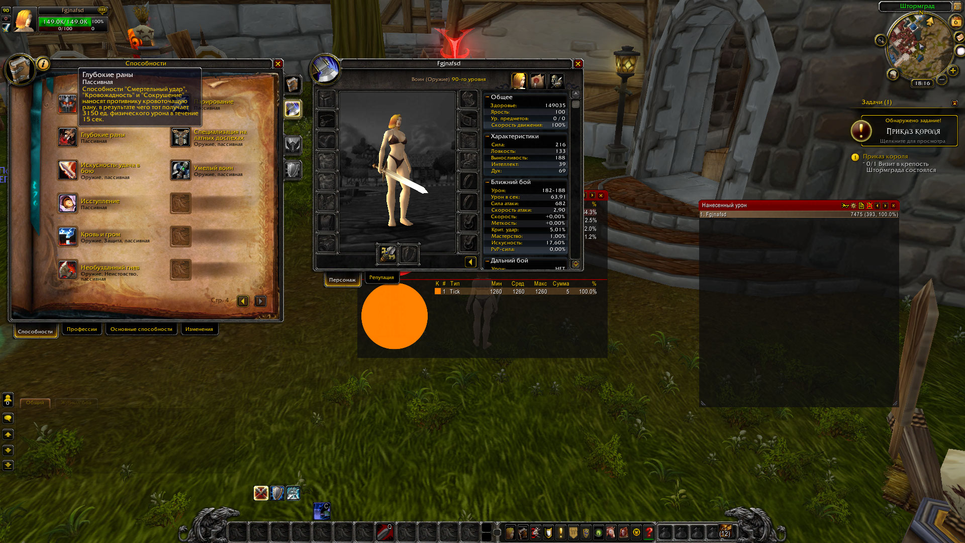 Как работает на другой пиратке меня (как и разраба) не интересует. Заходите сюда https://web.archive.org/web/20140727145412mp_/http://ru.wowhead.com/spell=115768 берёте формулу "1800 (+ 198% of Attack power)", смотрите на кол-во статы "Attack Power" у себя и считаете в спеке фурика: У меня на тесте было 63616 ед. AP и общий урон (за все тики) у пасивки 115768 составляет = 127760 ед. 1800 + 62343 (это 98%) + 63616 (это оставшиеся 100%) = 127759 ед. всего урона за 15 сек. А теперь делите это число на 5 (количество тиков за весь период доты 115767), получается - 25551 ед. урона за тик (по нпс). 5876 ед. урона будет уже по игроку с 77% пвп устойчивости. 11497,95 ед. урона будет уже по игроку с 55% устойчивости (на х5 сервере). Так как там в данный момент 55% устойчивости. Армс: Тут уже всё просто, умножаете предыдущие показатели на 2 (ап урона у доты на 100%) и получаете урон по плееру (без учёта мода на +25% урона с спека): С 77% устойчивости = 11752 ед. урона за тик. С 55% устойчивости (х5 сервер) = 22995,9 ед. урона за тик. |