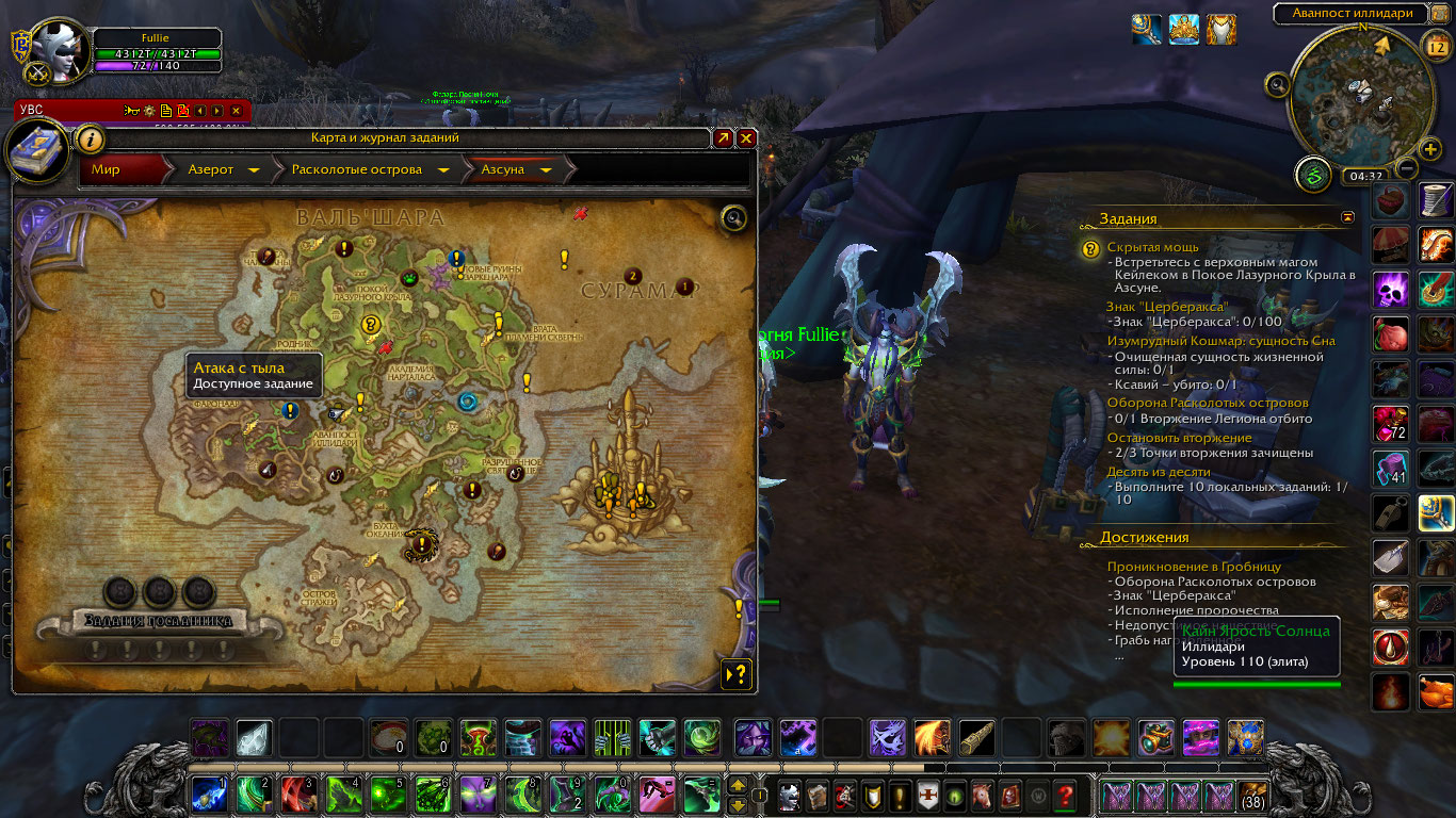 | Description | Получила квест "Скрытая мощь", но не нашла Кейлека в Покое Лазурного Крыла. Прочитала, что нужно выполнить в Азсуне этап "Оборона Покоя Лазурного Крыла", чтобы он появился. Пошла искать, какой у меня последний квест в Азсуне сделан. На карте отображался доступным "Атака с тыла". Пришла на Аванпост иллидари, обошла его весь - квестов нет никаких, Кайн стоит пустой. Квеста, с которого начинается сюжетка в Азсуне ("В гущу боя"), тоже нет (и нет Кадгара там, где он этот квест должен давать). Макросом проверила несколько квестов из начала сюжетки Азсуны - у меня не выполнен ни один. Из сюжетных на карте только недоступная "Атака с тыла". | ||||