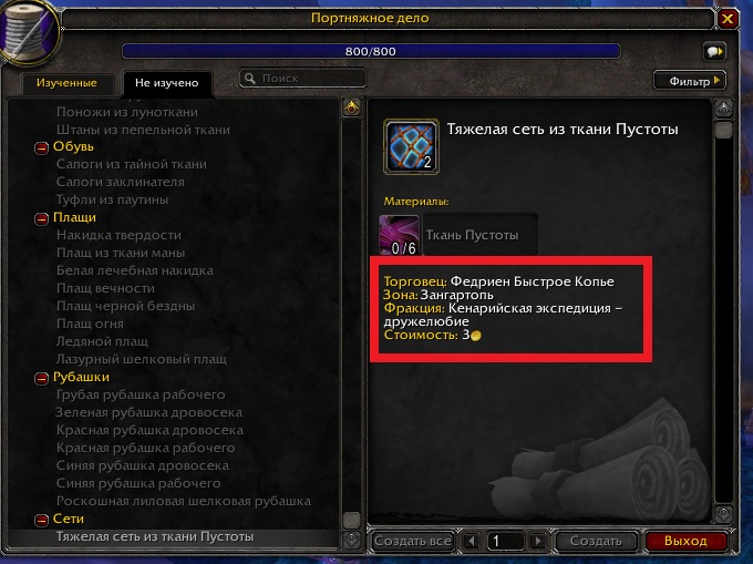 | Description | https://www.wowhead.com/wotlk/ru/item=24315/выкройка-тяжелая-сеть-из-ткани-пустоты - должна продаваться у https://www.wowhead.com/ru/npc=17904/федриен-быстрое-копье (скрин), у нас нет в продаже. | ||||