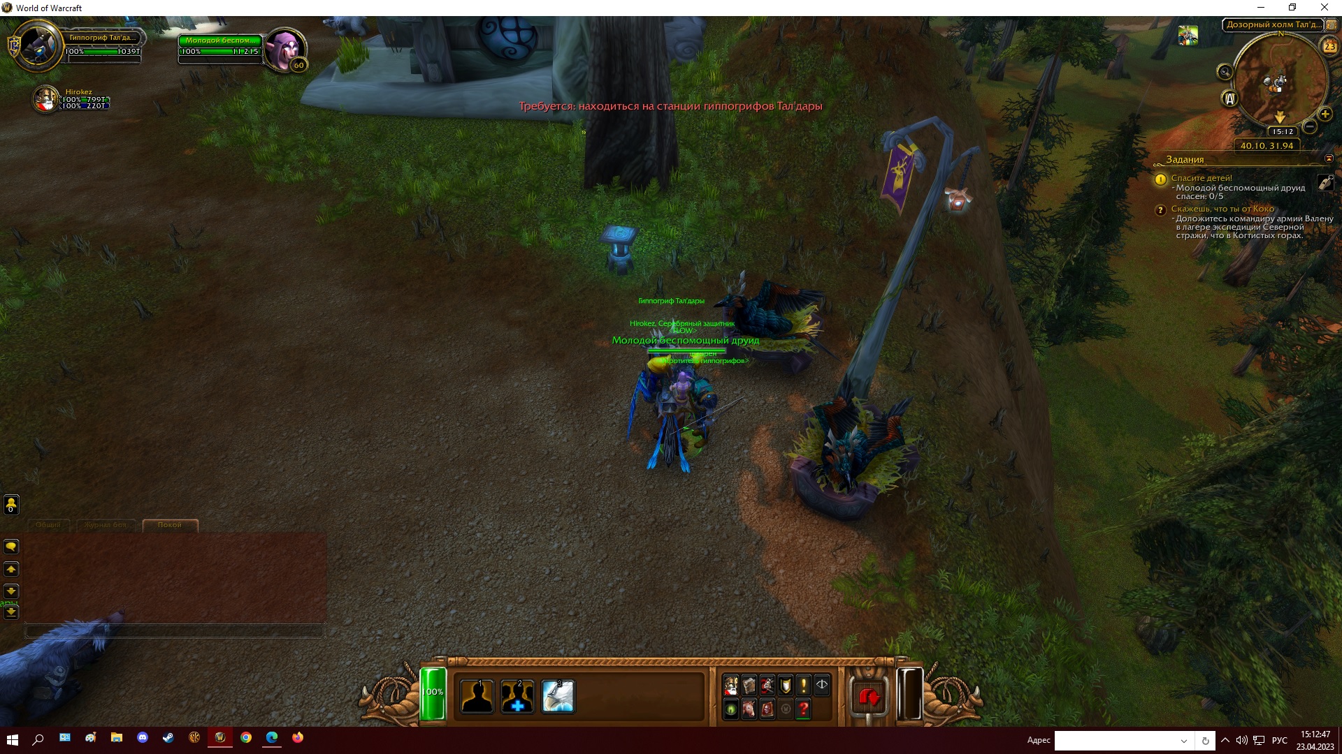| Description | https://www.wowhead.com/ru/quest=25889/%D1%81%D0%BF%D0%B0%D1%81%D0%B8%D1%82%D0%B5-%D0%B4%D0%B5%D1%82%D0%B5%D0%B9 В когтистых горах не работает. Нужно использовать квестовый свисток, чтобы вызвать гиппогрифа, долететь до друида в Роще Тал'Дары, поднять его на гиппогрифа пассажиром, долететь с ним обратно к гиппогрифам на дозорный холм Тал'Дары и там высадить возле Телорена. Работает всё, кроме последнего пункта. Я не могу высадить друида. "Требуется: находиться на станции гиппогрифов Тал'Дары". Без этого квеста я не смогу получить достижение Хранитель мудрости | ||||