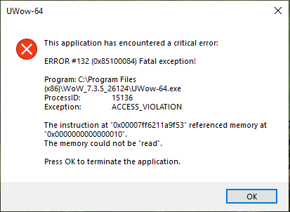 | Steps To Reproduce | 1. Зайти в игру через ULauncher 2. Ввести пароль 3. Выбрать персонажа 4. Экран загрузки 5, под конец загрузки ошибка и лаунчер просит закрыться | ||||