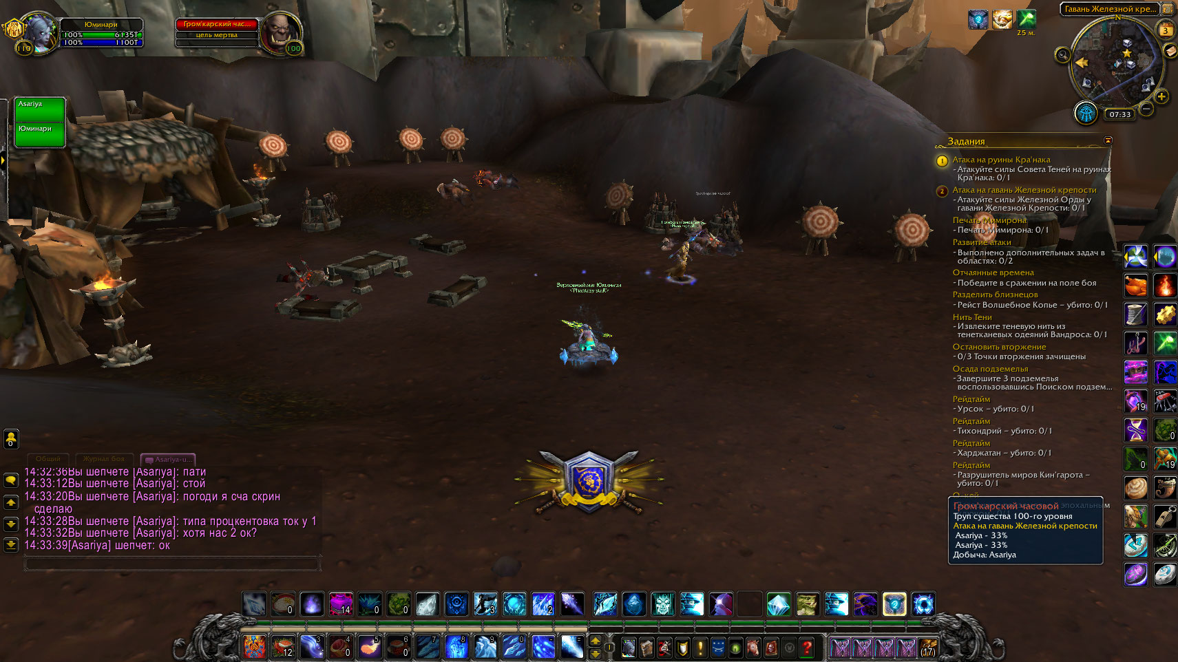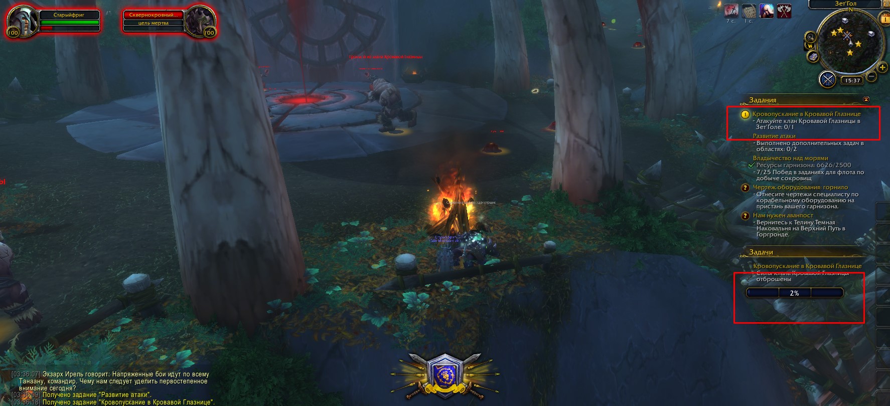 ну нету у меня шкалы . Есть квест развитие атаки ( 2 дополнительных задания) . На атаку которая берется с командирского стола, квесты, при прилете в область их выполнения видно только область ( границы выполнения задания) и все. процентовки нет на выполнение. Пробовала делать атаку уже в пати с человеком, у которого есть процентовка. Тому зачитывает все задания, а мне нет. |