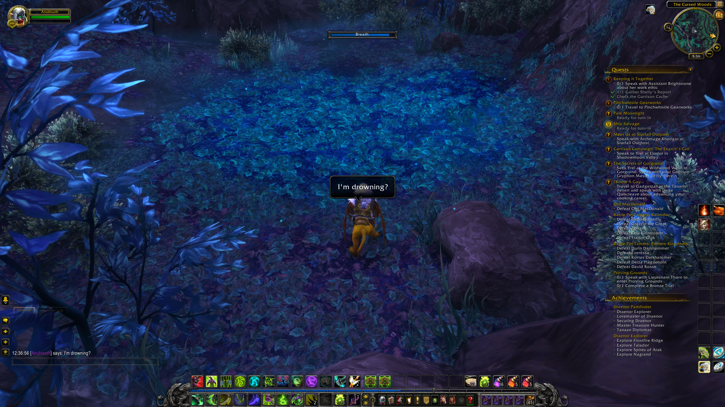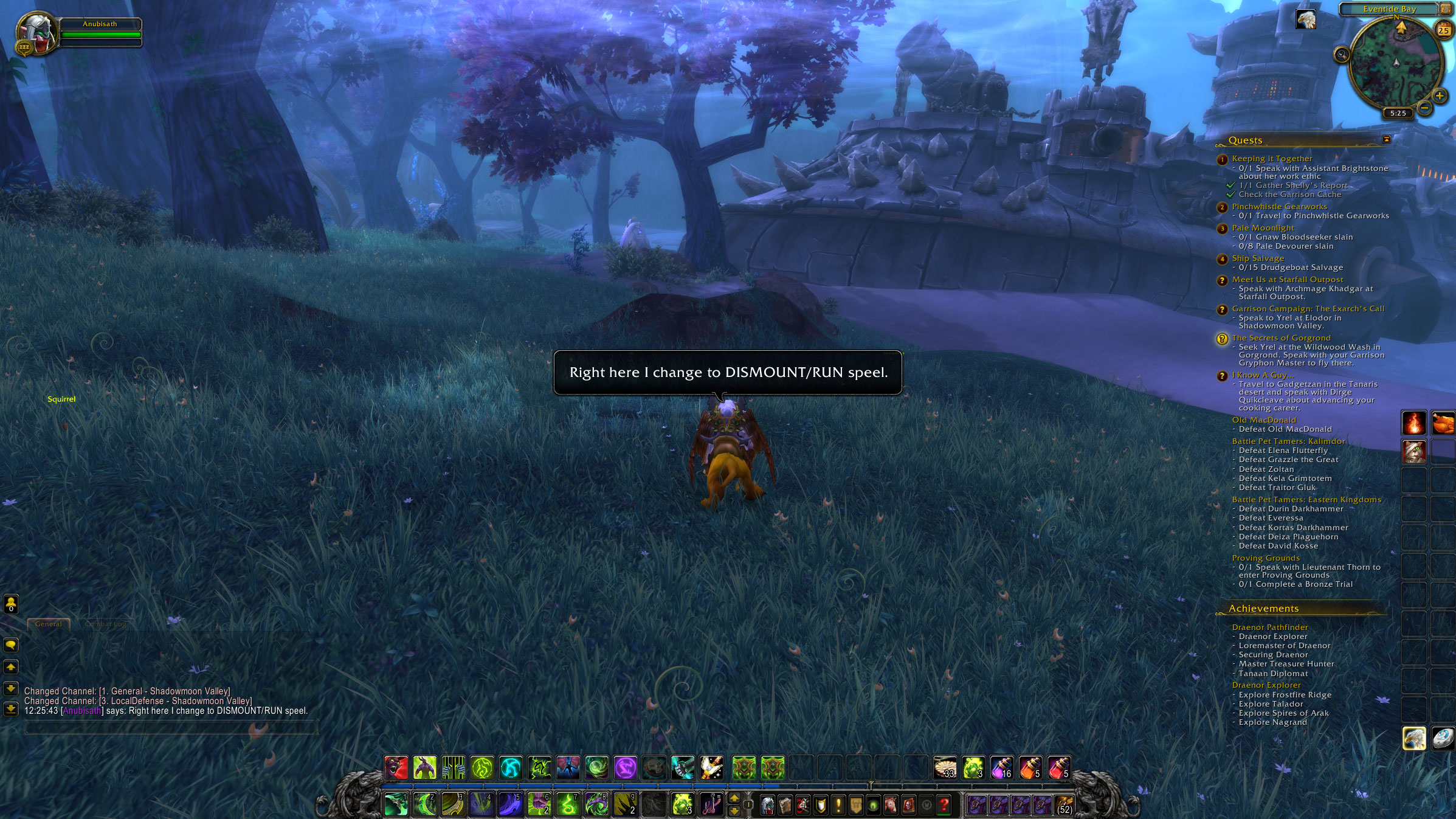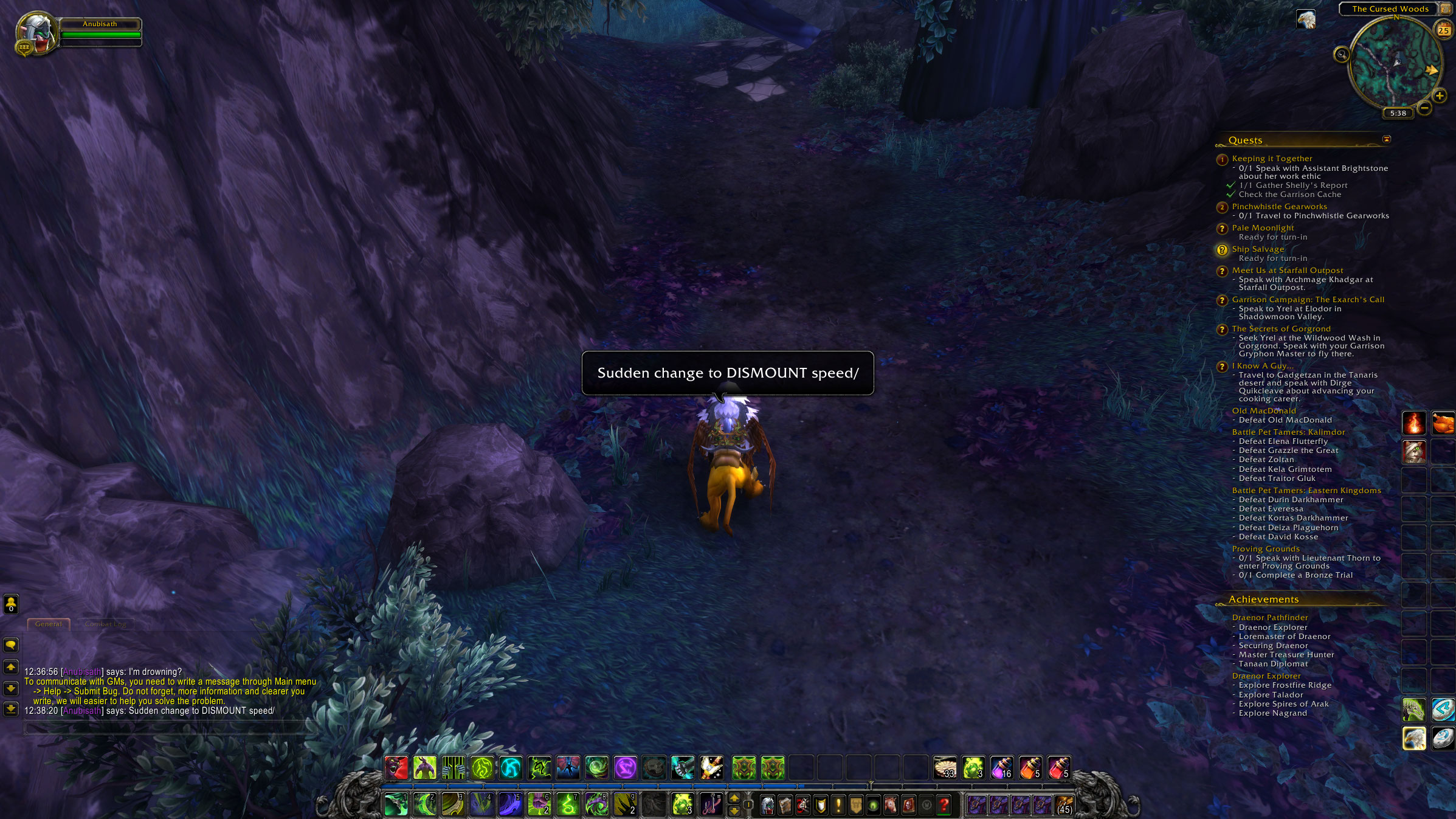 I experience this also, with all toons. Riding from Garrison level 1 to Salvage Ship I drop from riding to running speed suddenly. Client shows me still mounted. Server moves me as on foot. Cannot dismount (since the Server sees me as dismounted?) so I must mount another beast to re-mount my Griffon. Then move speed is again fast riding. Return trip via Starfall Outpost after completing quest Pale Moonlight quest=35174, again forced to dismounted speed. Looking for the edge of the area, I found myself "under water". Movement animation is not aquatic! I got to the dismount point, and attempted to change mount, got red text error "Can't do that while moving". I was standing still. At least I'm no longer drowning. I take a few steps forward, attempt to mount, I get red error text "You can't use that here". Take a few more steps and I can mount/change mount, but I'm at dismount speed still. Also, cursed toads and wolves appear and fade out. Phasers set to Chaos. My DH can't sprout wings here. The Cursed Wood is well named. |