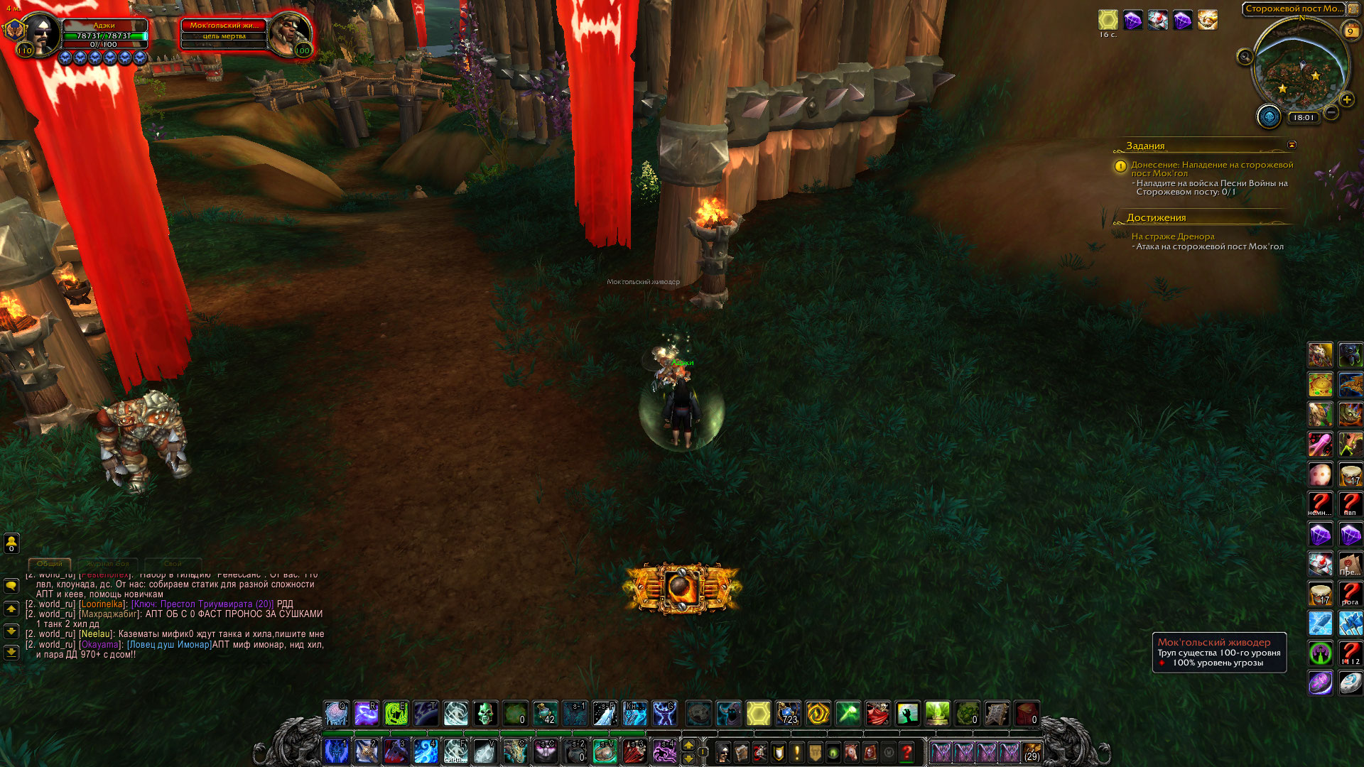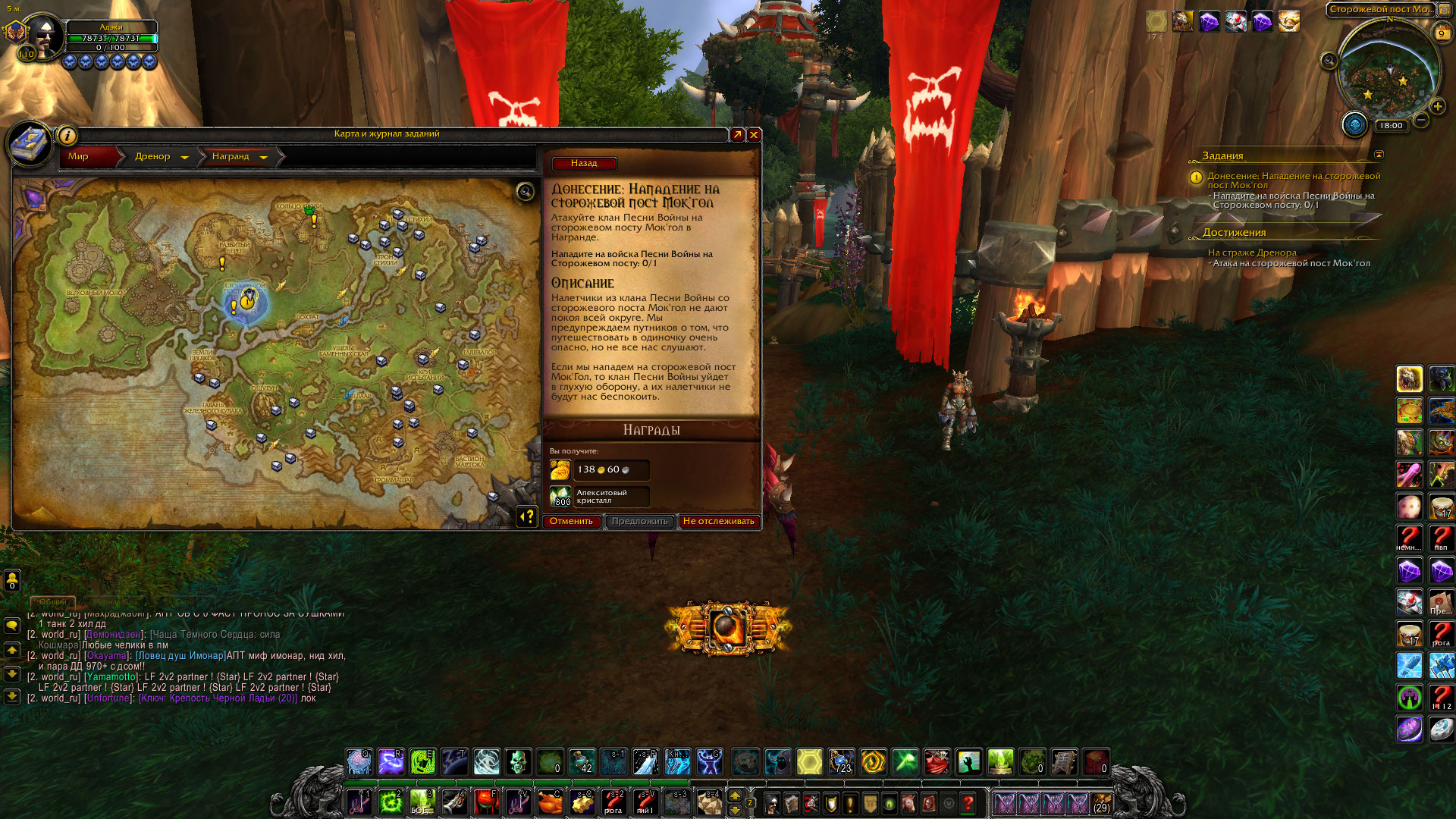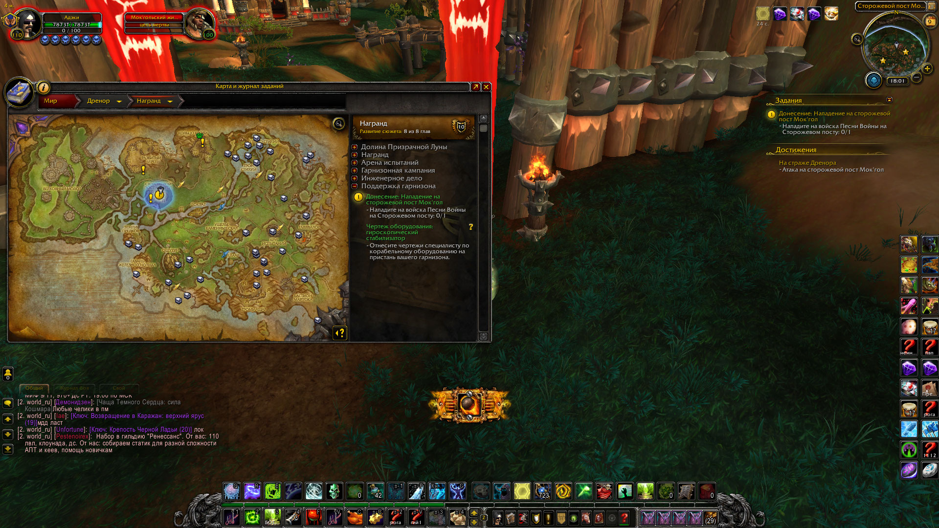 | Description | Не включается локальное задание "Донесение: Нападение на сторожевой пост Мок'Гол" что находится в Дреноре на локации Награнд. Данный квест покупается у интенданта (вендор), что мною и было сделано, но дальнейшее его прохождение на данный момент невозможно, по причине того, что просто не включается по прибытии в локацию. Отсчет в процентах (убийство мобов на локации) не включается. ( Релог не помогает, заход на место квеста с разных сторон так же не спасает) | ||||