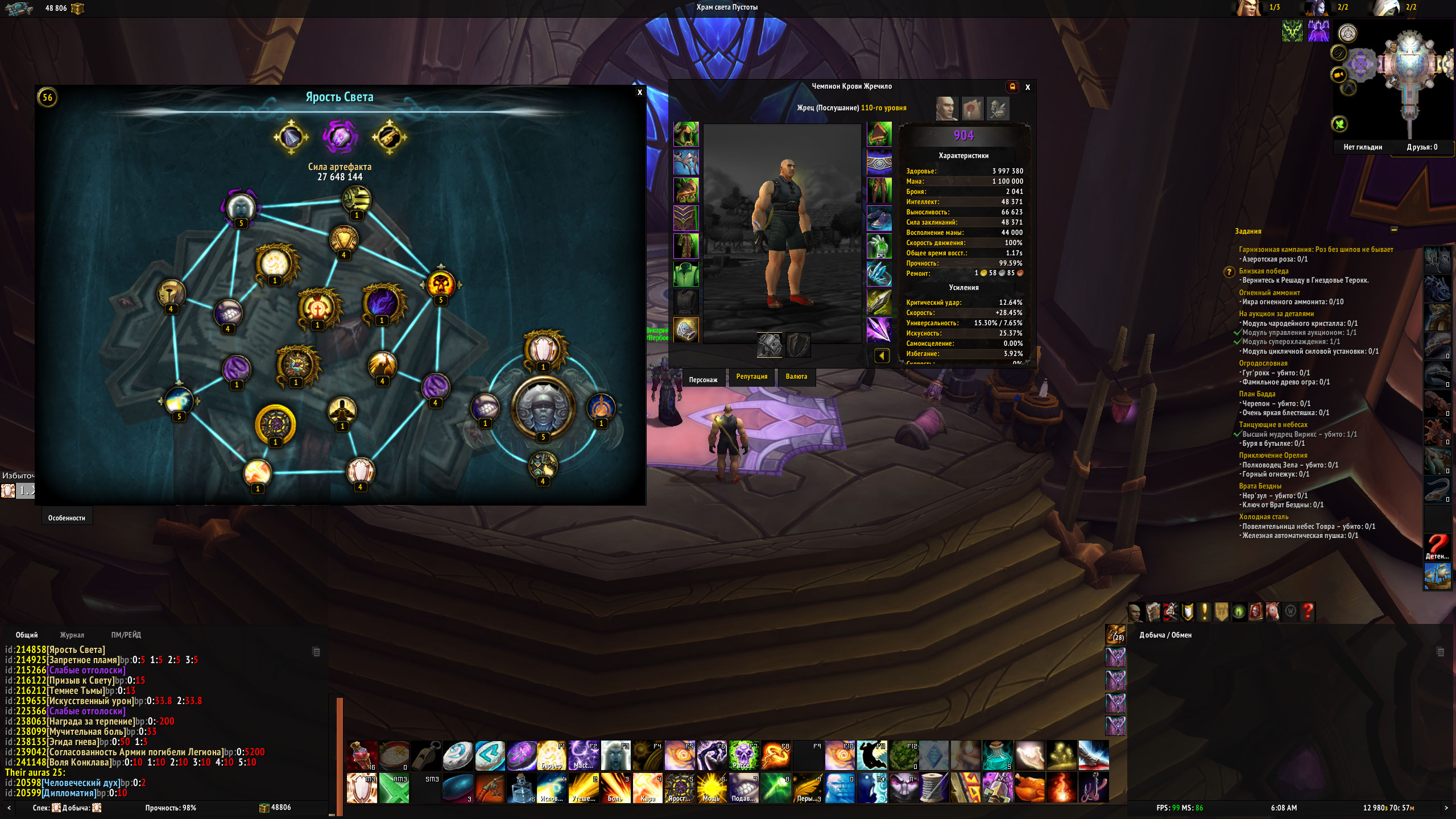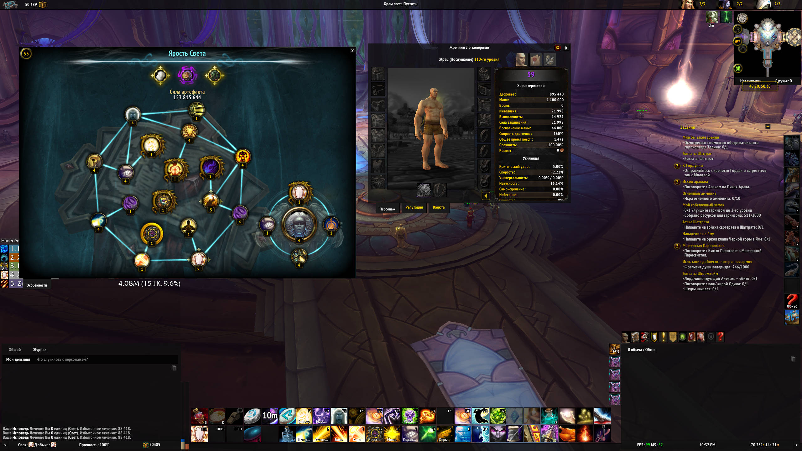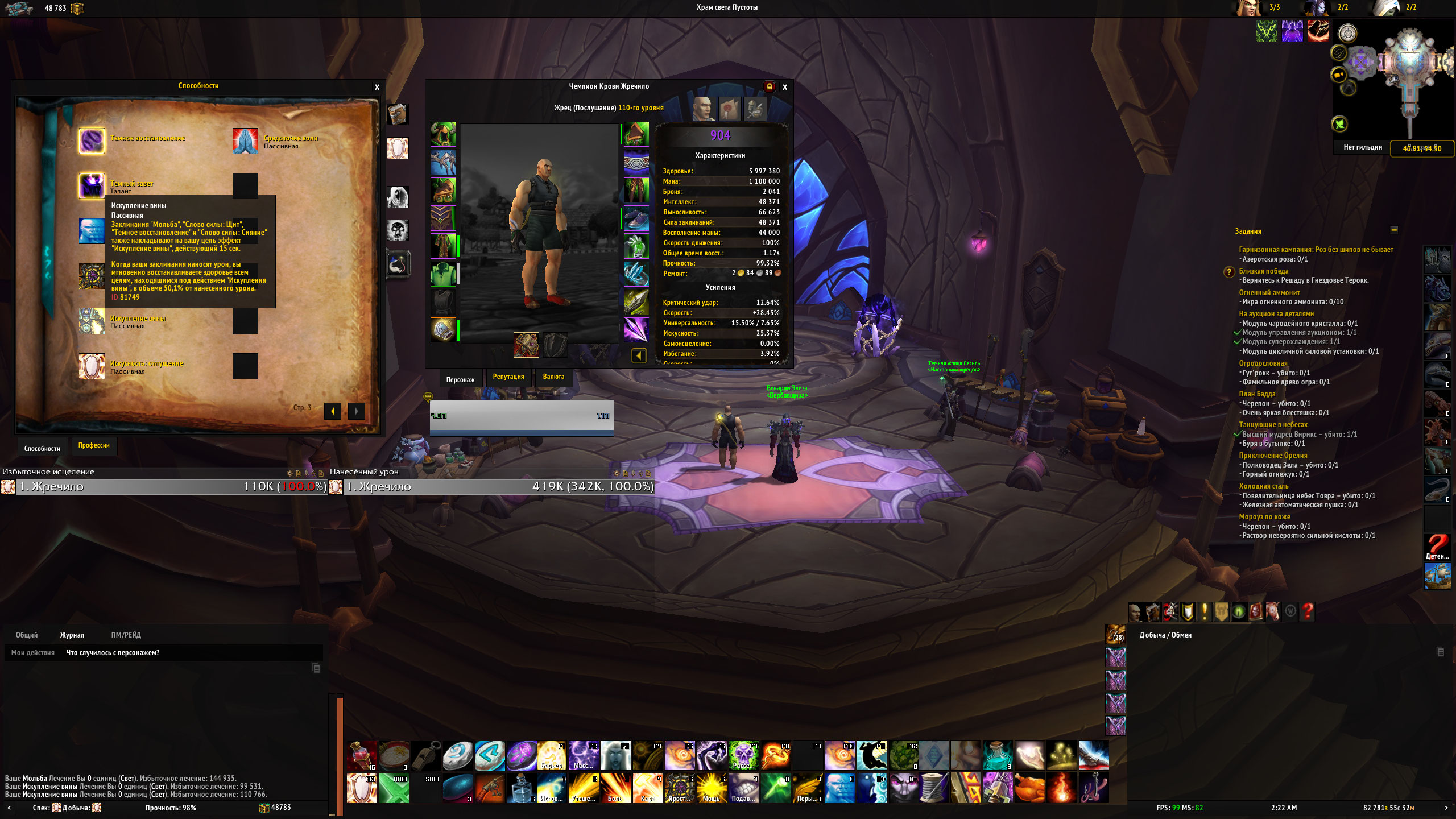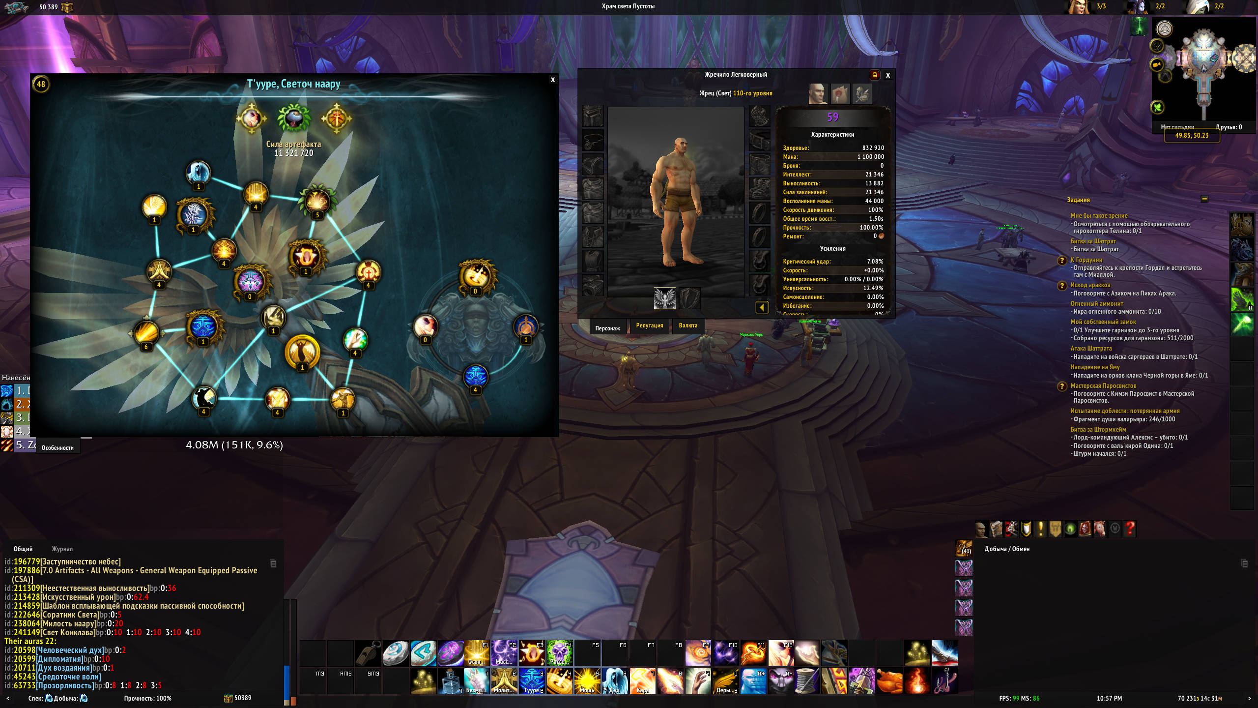 В общем решил потестить вашу математику более предметно и прифигел. Снято всё. Базовые значения интеллекта, и соответственно силы заклинаний у жреца света 110 уровня составляют 7694. Исцеляя самого себя я получил базовый множитель умения "Исцеление" 5. Т.е. делил полученное в журнал (то значение что отдал ваш сервер) 38471 на силу заклинаний из характеристик. Будем от этого и отталкиваться. Сколько бы предметов экипировки на интеллект я ни одел, я всегда получаю коэффициент 5 (если быть совсем точным, то 5,000105340777415) Одеваю экипировку с рейтингом универсальности 472, что при подсчёте выдало в характеристиках 1.01% - всё сходится. В общем без артефакта универсальность работает идеально, а вот при одетом артефакте начинаются странности. Из описания, который всплывает при наведении мышкой на уровень мы видим что увеличивает урон за КАЖДУЮ ПРИОБРЕТЁННУЮ СПОСОБНОСТЬ, т.е. при наличи трёх реликвий это +3 способности. Из многочисленных гайдов по артефактам легиона мы знаем что каждый уровень добавляет +1% к выносливости, урону и исцелению, исключение составляют ДЦ, там урон и исцеление за каждую способность артефакта добавляет +0.75% к урону и исцелению И вот мой голый перс с единственным артефактом 48 уровня + 3 реликвии выдаёт в журнал 138067 отхила. При одетом артефакте значения интеллекта и соответственно СЗ составляют 21346, что при делении даёт множитель 6.46, но при подсчёте уровня артефакта 48 +3 зареликвии мы должны были получить множитель 7.55 т.к. умножать надо 1.51 |