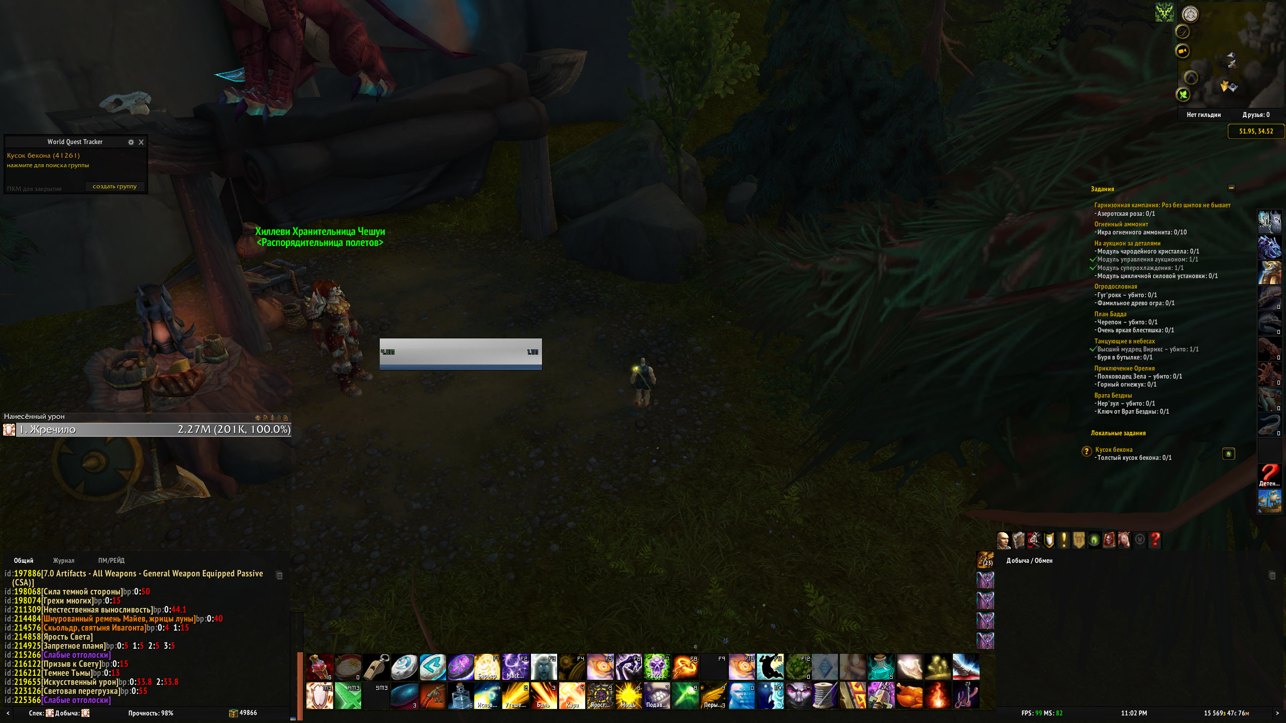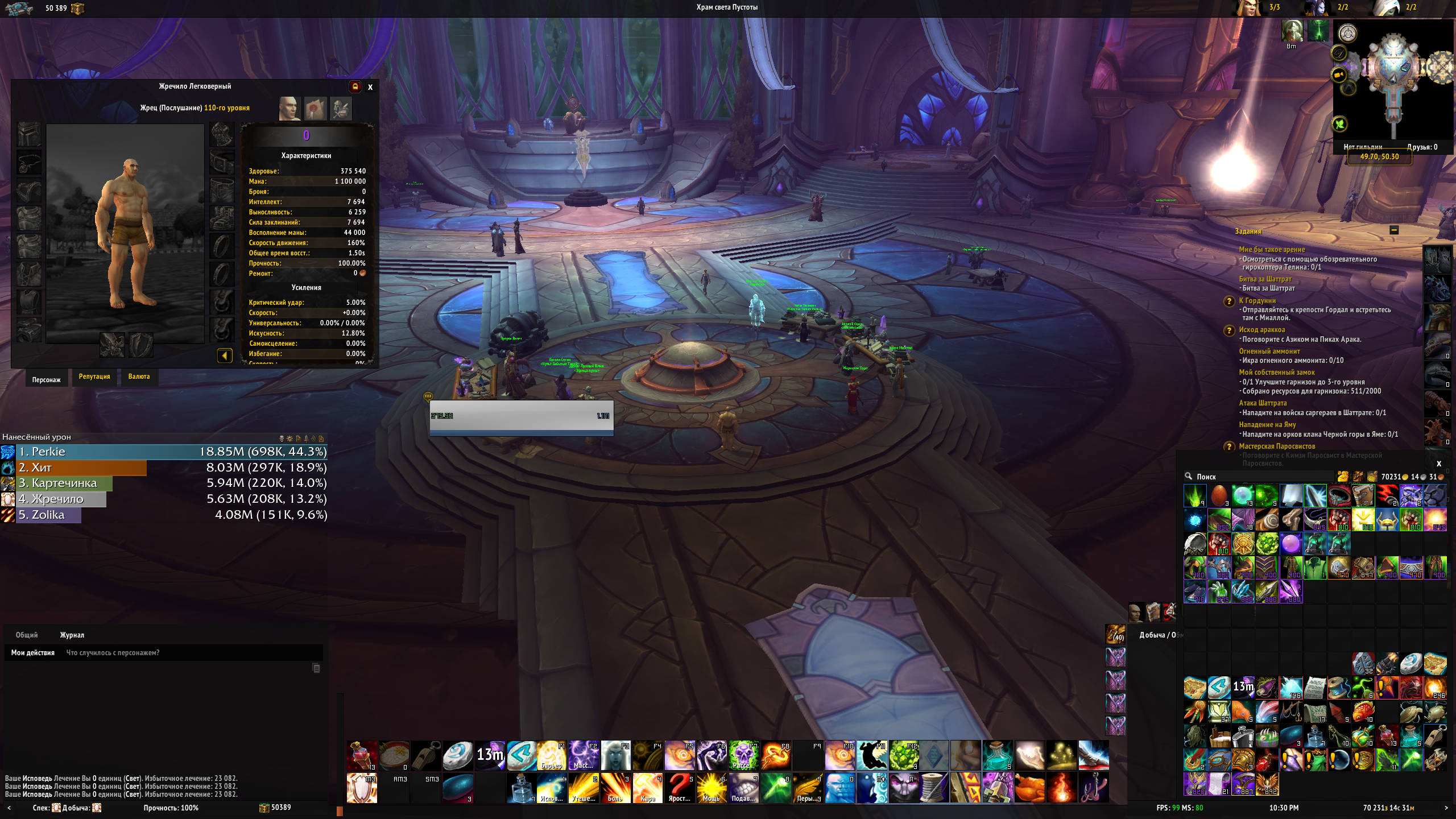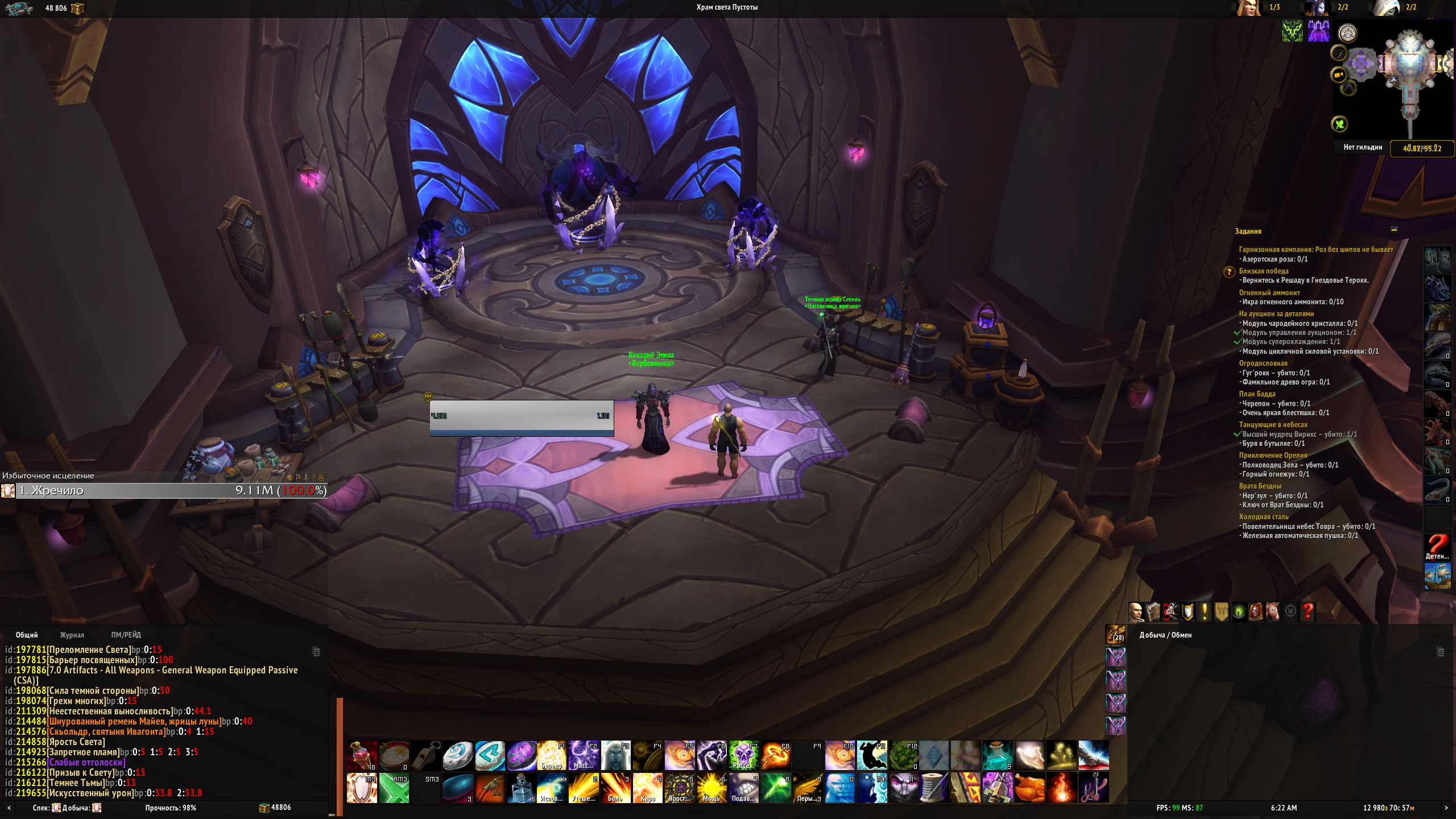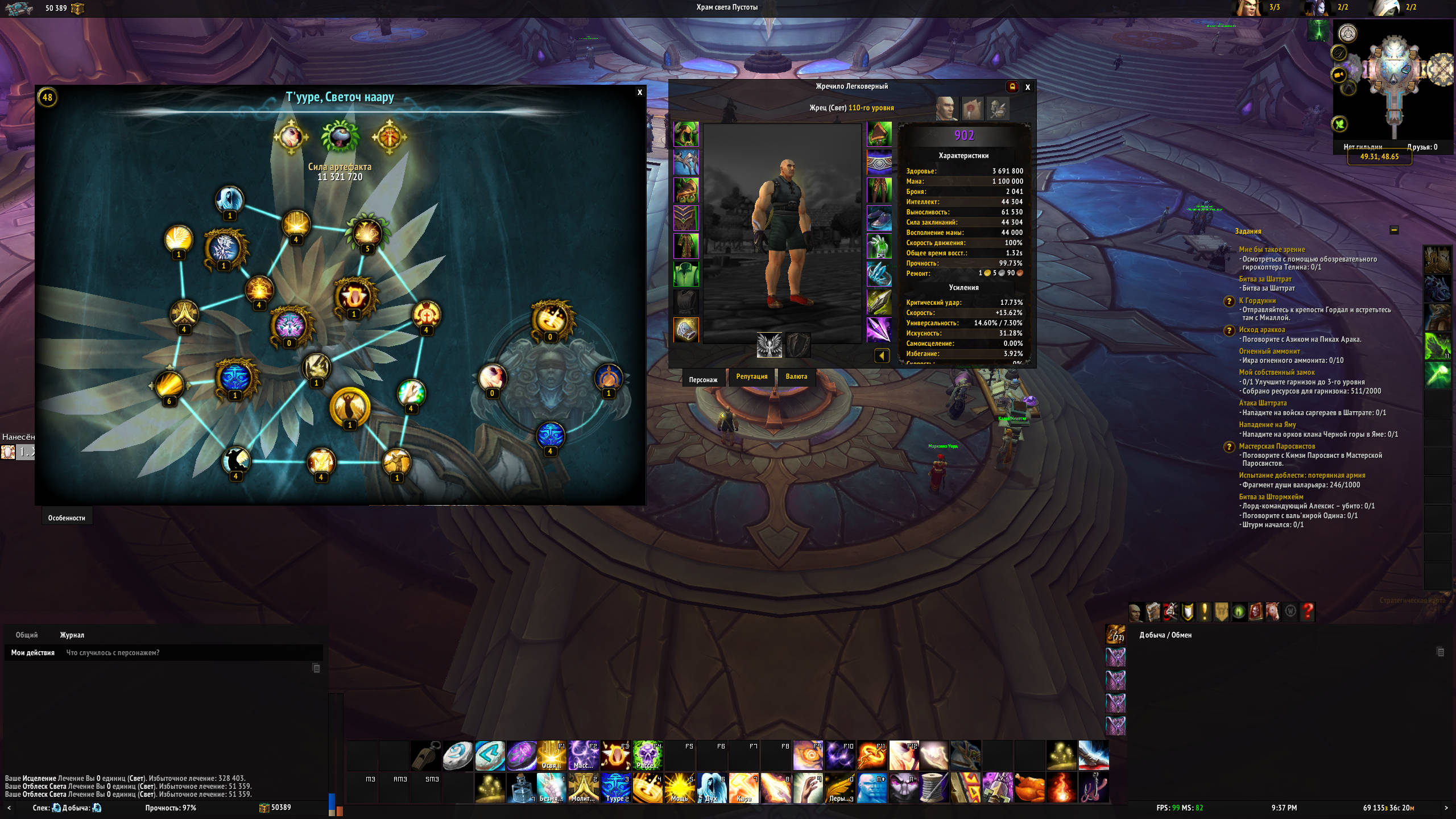 В общем решил потестить вашу математику более предметно и прифигел. Снято всё. Базовые значения интеллекта, и соответственно силы заклинаний у жреца света 110 уровня составляют 7694. Исцеляя самого себя я получил базовый множитель умения "Исцеление" 5. Т.е. делил полученное в журнал (то значение что отдал ваш сервер) 38471 на силу заклинаний из характеристик. Будем от этого и отталкиваться. Сколько бы предметов экипировки на интеллект я ни одел, я всегда получаю коэффициент 5 (если быть совсем точным, то 5,000105340777415) Одеваю экипировку с рейтингом универсальности 472, что при подсчёте выдало в характеристиках 1.01% - всё сходится. В общем без артефакта универсальность работает идеально, а вот при одетом артефакте начинаются странности. Из описания, который всплывает при наведении мышкой на уровень мы видим что увеличивает урон за КАЖДУЮ ПРИОБРЕТЁННУЮ СПОСОБНОСТЬ, т.е. при наличи трёх реликвий это +3 способности. Из многочисленных гайдов по артефактам легиона мы знаем что каждый уровень добавляет +1% к выносливости, урону и исцелению, исключение составляют ДЦ, там урон и исцеление за каждую способность артефакта добавляет +0.75% к урону и исцелению И вот мой голый перс с единственным артефактом 48 уровня + 3 реликвии выдаёт в журнал 138067 отхила. При одетом артефакте значения интеллекта и соответственно СЗ составляют 21346, что при делении даёт множитель 6.46, но при подсчёте уровня артефакта 48 +3 зареликвии мы должны были получить множитель 7.55 т.к. умножать надо 1.51 |