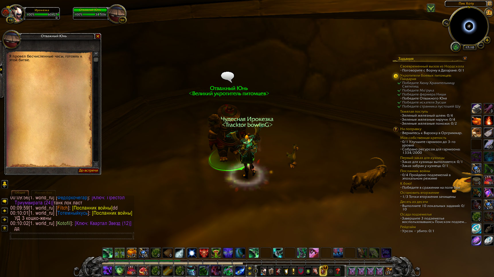 | Description | при выполнение задания по битвам питомцев: Укротители боевых питомцев Пандария (необходимо победить вышеперечисленных НПЦ Хюна хранительница святилищ, Морук, Ниши, странник пустошей Шу, искатель Зусши, отважный Юнь), возникла проблема следующего характера: НПЦ Отважный Юнь, стоящий в пещере неподалеку от Пика Коту не дает диалога о вступлении в битву. Скрин прилагается. | ||||