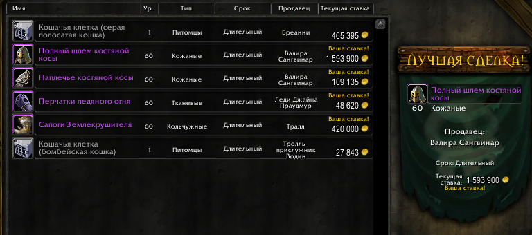 Мне тут кто-то ответит? Уже неделя прошла с создания, вещи до сих пор висят (кроме Сапогов Землекрушителя, они пришли, но они и были самыми новыми из этой четверки), цена менялась только на Перчатках единожды. Не знаю сколько, но уже полмесяца-месяц висят эти ставки. |