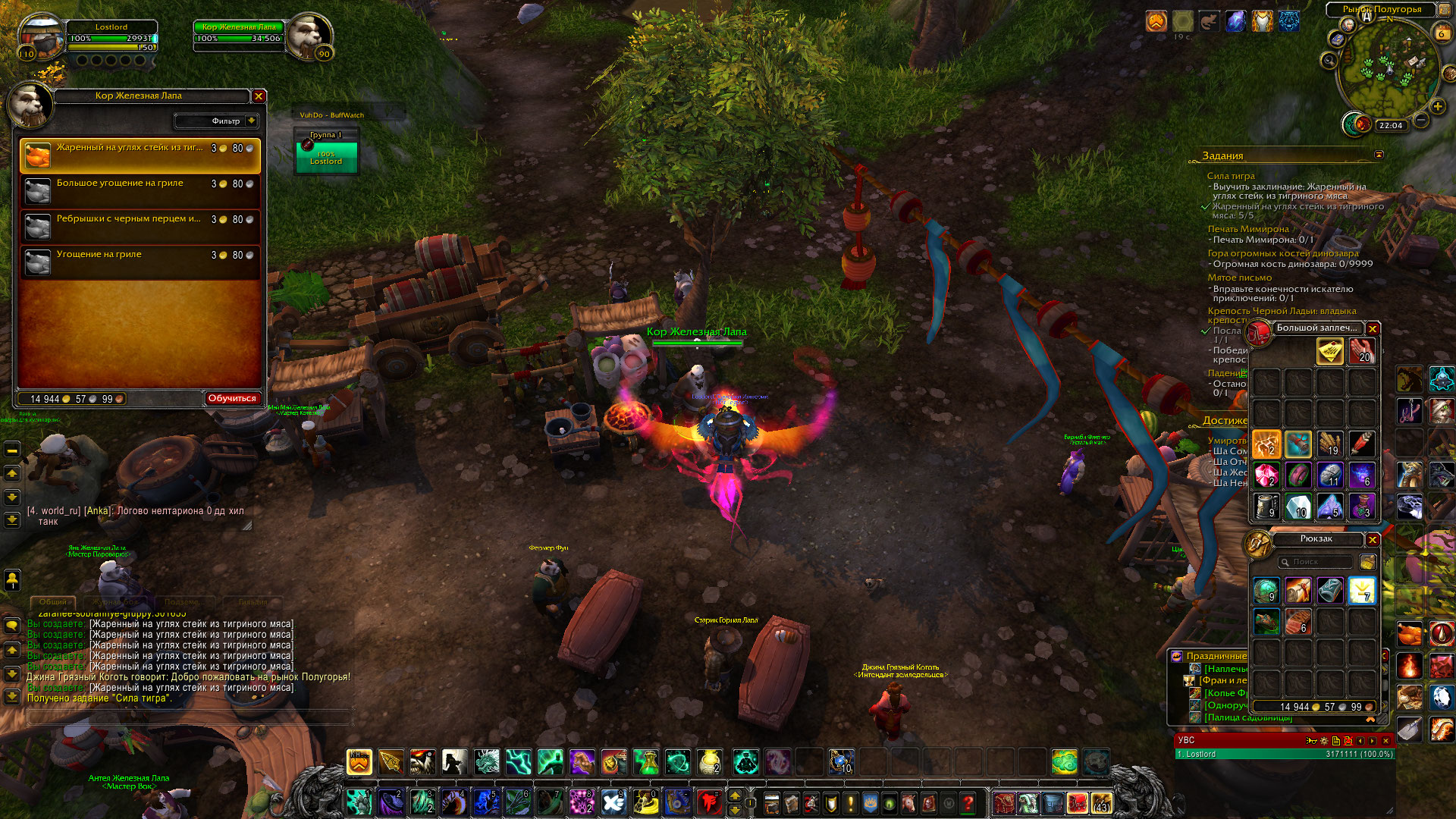 | Description | Не изучается рецепт "Жаренный на углях стейк из тигриного мяса". Вместо изучения он готовит его, а квест "Сила тигра" таким образом сдать невозможно. Моб Кор Железная Лапа в Долине Четырёх Ветров. | ||||