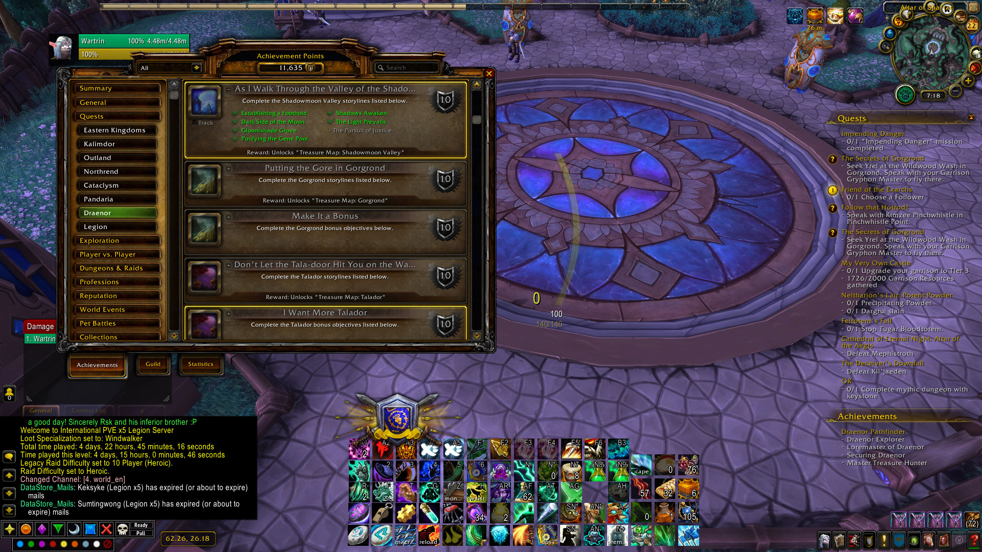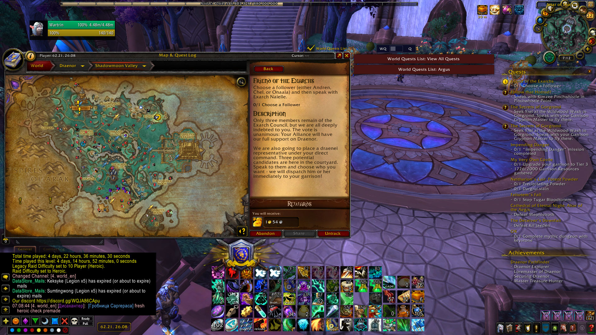 | Description | i am currently attempting to do the draenor pathfinder on my monk: "Wartrin" on legion x5 and the questline for the pursuit of justice isnt working after completing "https://www.wowhead.com/quest=34786/engorged-goren , https://www.wowhead.com/quest=35070/shut-er-down" i should have gotten "https://www.wowhead.com/quest=34787/exarch-maladaar" but ive completed this quest before the 2 above and O'Shea in dalaran also says ive completed it so i asked a gm for help and he gave me the next quest in the chain which is "https://www.wowhead.com/quest=34788/friend-of-the-exarchs" and the npcs arent here. He said to write it here on the tracker. | ||||
