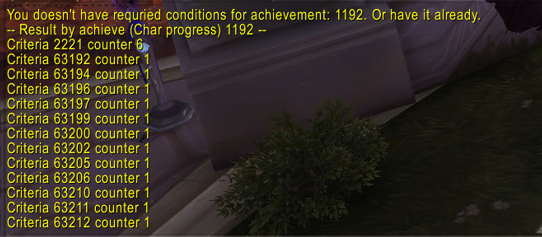 | Description | После выполнения всех цепочек квестов в Награнде (Запределье) для достижения (https://www.wowhead.com/achievement=1192/nagrand-slam), на экране достижений все критерии светятся зеленым, но самого достижения нету. При попытке засчитать его через дебаггер, получаю ответ "не все критерии выполнены или уже есть достижение". При запросе списка критериев, получаю следующее: Criteria 2211 counter 6 Criteria 63192, 63194, 63196, 63197, 63199, 63200, 63202, 63205, 63206, 63210, 63211, 63212 counter 1. Квесты сделаны все, проверял по вовхеду, делал даже необязательные. | ||||