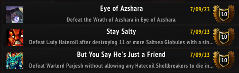 Steps To ReproduceGo into Eye of Azshara (in my case from LFG) > kill the bosses > get the achievements [Stay Salty] and [But You Say He's Just a Friend].