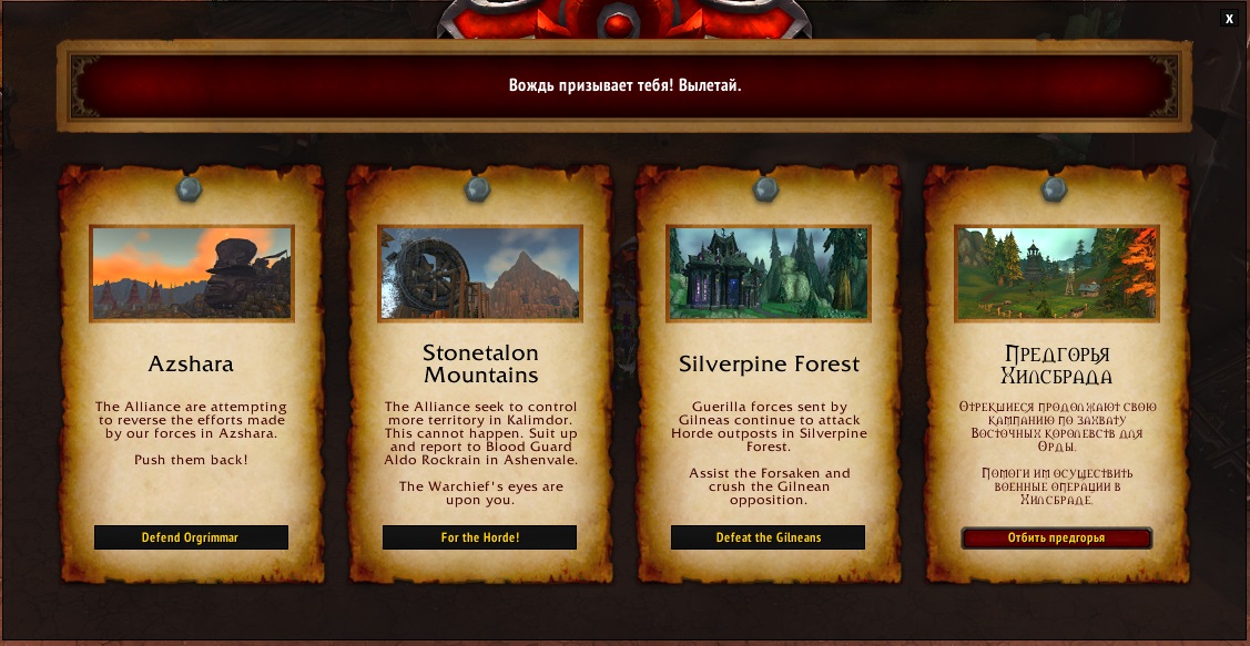 | Description | More visible in the screenshot, but title text is in Russian, not English, as is the rightmost quest (for Hillsbrad Foothills). | ||||