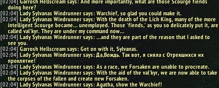 | Description | One line from Sylvanas in the RP between Sylvanas and Garrosh is still in Russian, while the rest of it is in English. Screenshot attached. | ||||