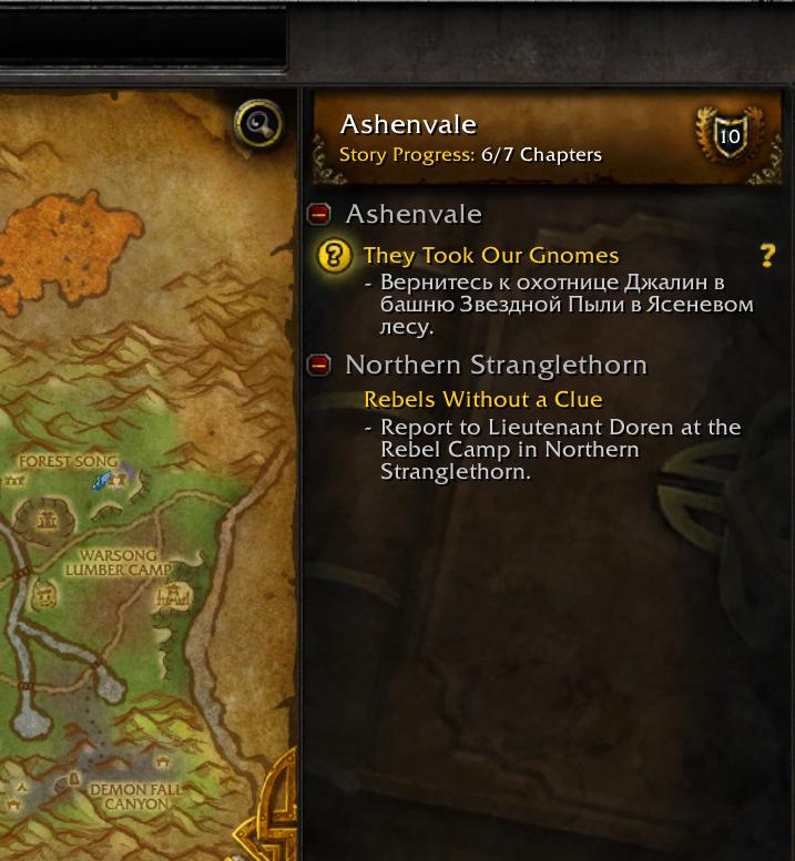 | Description | In Ashenvale the quest "They took our gnomes" is missing the translation, when we rescued the two gnomes, if we open the quests section, the text has changed to Russian. | ||||