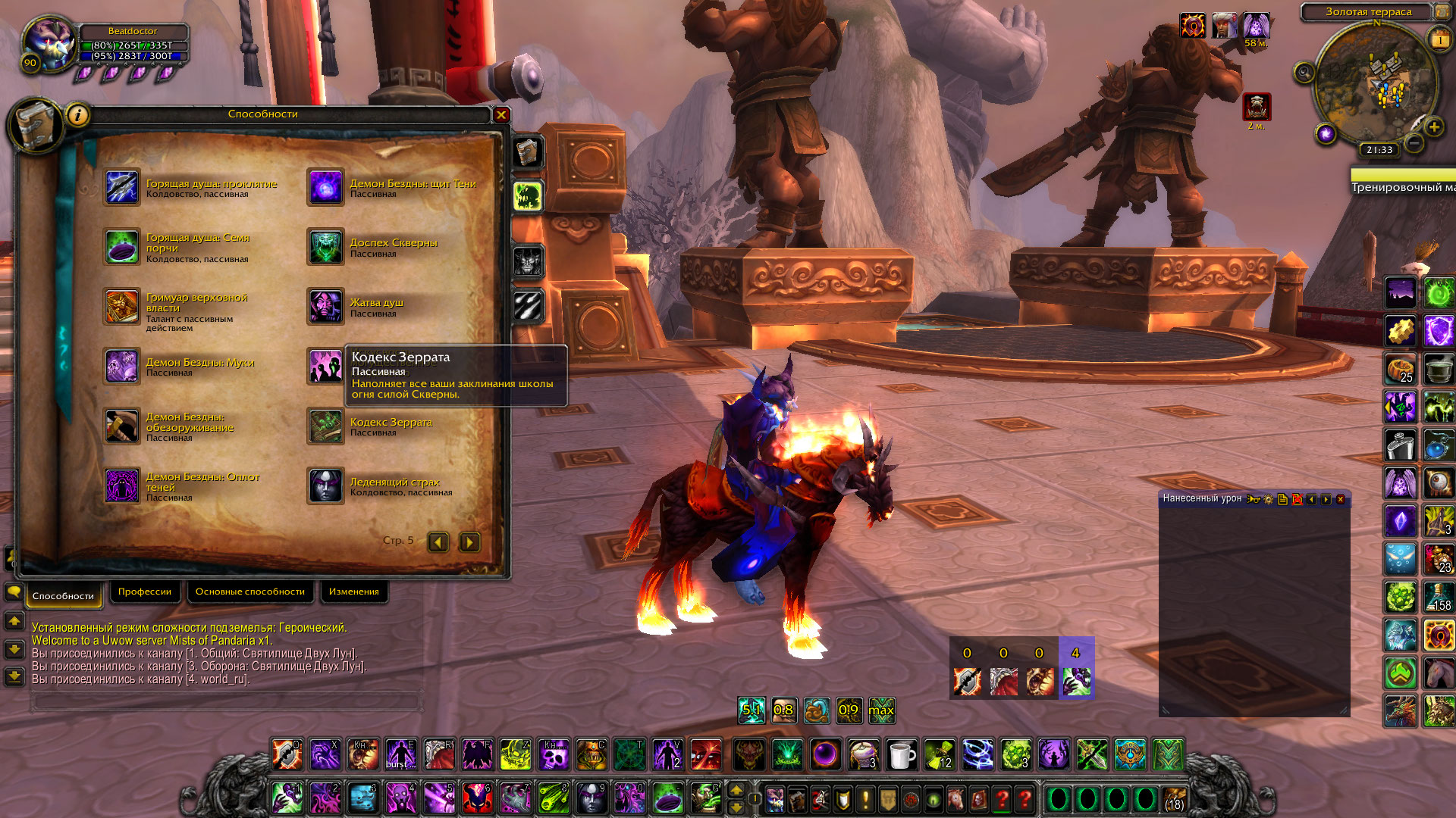 Перекраску всех остальных спеллов поправили. @Revventon для полноценно рабочего "Зелёного огня" должна быть ещё выучена пасивка 137206. Напишите тикет в игре, чтобы ГМы выдали Вам вторую пасивную ауру. |