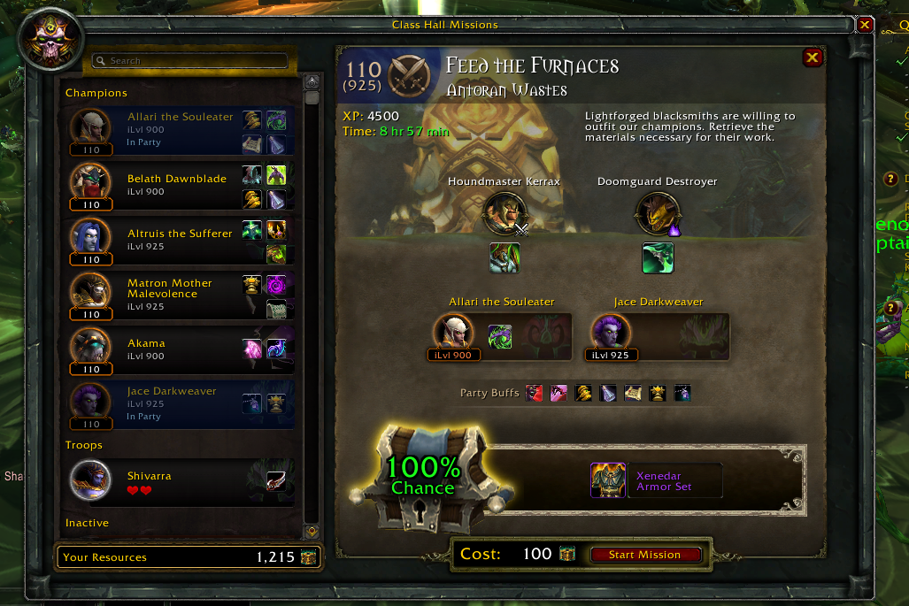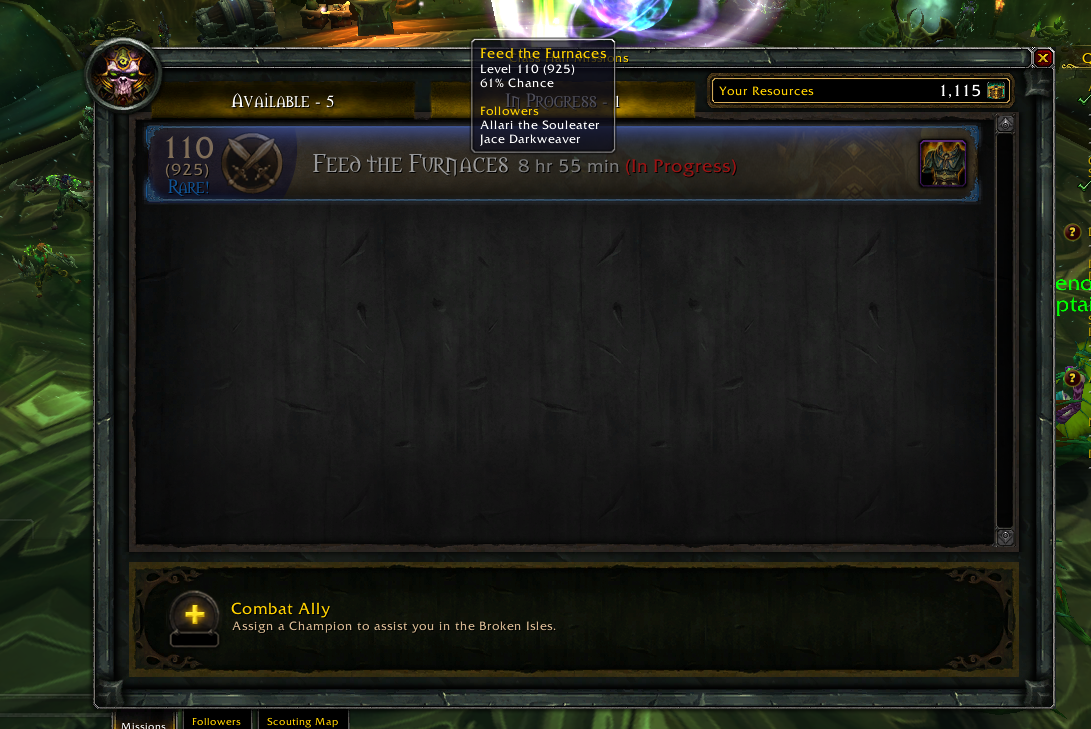 | Description | Hello. The following quest: " Relics of the ancient eredar" https://www.wowhead.com/quest=48446/relics-of-the-ancient-eredar, requires you to have followers on ILVL 925. It is a part of an Argus quest chain. Follower quests that give rewards (such as Feed the Furnaces, see picture) display wrong values. At the start of the quest, it says that quest chance is 100%, and I selected 2 followers on purpose to be EXTRA sure that quest will be completed, since one follower gave 100% and technically should be enough. But, after I initiated the quest, it can be checked how much time there is left on quest and quest success chance. This time around, the follower quest that I started, the one that had 100% success rate, now only had 61% for some reason. I already had one quest wasted yesterday because of that, I had no idea why it happened since it was 100% complete rate before I started it, but I decided to look around some to see what could have caused the failure. Now its obvious that quest complete chance is faulty before quest is started - maybe due to some visual bug that I hope you can fix. Check images that I attached. Pic1 how it looks before you start and pic 2 how it looks after. Notice that you cant abort the quest after you start it and you dont have a clue about that quest has lower success rate untill you start it. If that keeps up, the quest chain simply cannot be completed as you will never get items you need to upgrade your followers, there are no other ways known to me. | ||||