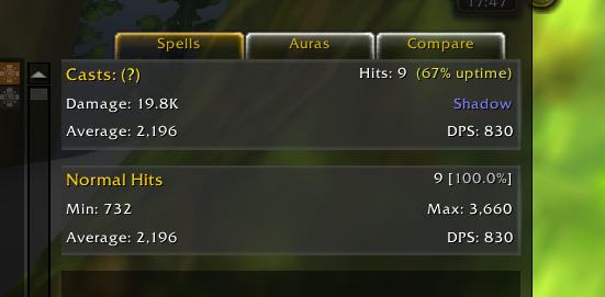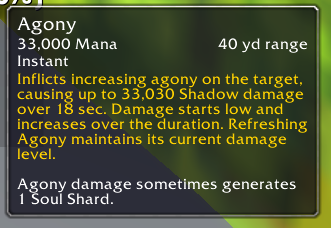 Legion Patch 7.2.0 (2017-03-28): Rank 2 added at level 52: Agony may now ramp up to 10 stacks. Legion Hotfix (2017-01-17): Agony now has its full chance to generate a Soul Shard on Soul Effigy (was 55% of normal chance). Legion Patch 7.1.0 (2016-10-25): Damage increased by 5%. Now learned at level 10 (was 6). Legion Hotfix (2016-09-28): Fixed a bug that sometimes caused Agony to not stack or generate Inv misc gem amethyst 02 [Soul Shards]. Legion Hotfix (2016-09-23): Agony damage increased by 5%. Legion Patch 7.0.3 (2016-07-19): Damage increased by 644%, duration reduced to 18 seconds (down from 24). Now learned at level 6 (was 36). (Last one is a diff compared to WoD so obviously the damage output change is outlandish) I'd like to add that soul shard generation from agony seems very undertuned. This is the formula used in Dragonflight Simcraft. https://github.com/simulationcraft/simc/blob/dragonflight/engine/class_modules/warlock/sc_warlock_affliction.cpp#L67 https://github.com/simulationcraft/simc/blob/dragonflight/engine/class_modules/warlock/sc_warlock_affliction.cpp#L111 And this is the average formula (asuming the random distribution is normal, which it should be) https://github.com/simulationcraft/simc/blob/977091af14f7aef14be5818f5b7a18e767850ccf/engine/class_modules/warlock/sc_warlock.cpp#L2125 This is the formula used in Legion releases of Simcraft (release 735-01 - I cannot find 735-02) https://github.com/simulationcraft/simc/blob/e0cf2194896ce1988cfaf97006b2d8c4e7456162/engine/class_modules/sc_warlock.cpp#L2915 |