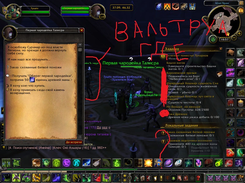 С этого квеста начинается финальная цепочка достижения Добрый сурамаритянин. Чтобы квест был доступен, нужно как минимум 20000/21000 почтения с Помраченными. Чародейка Вальтруа стоит внизу, спуститесь по лестнице. Смена времен года — www.youtube.com/watch?v=rPAE8HQvek0 Это задание - часть цепочки заданий Смена времен года нужной для достижения Добрый сурамаритянин |