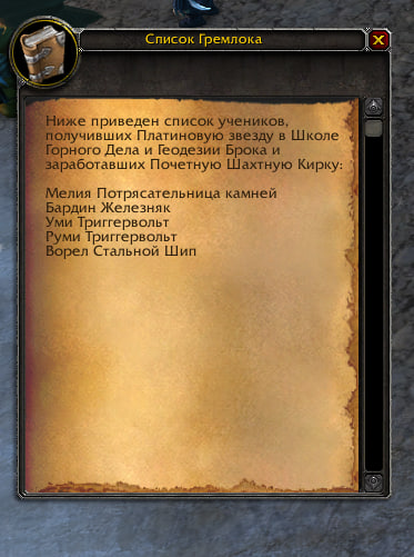 | Additional Information | Предмет www.wowhead.com/ru/item=16310/список-гремлока даётся при выполнении следующих квестов: 1. www.wowhead.com/ru/quest=6387/награды-ученикам 2. www.wowhead.com/ru/quest=6391/полет-в-стальгорн | ||||
