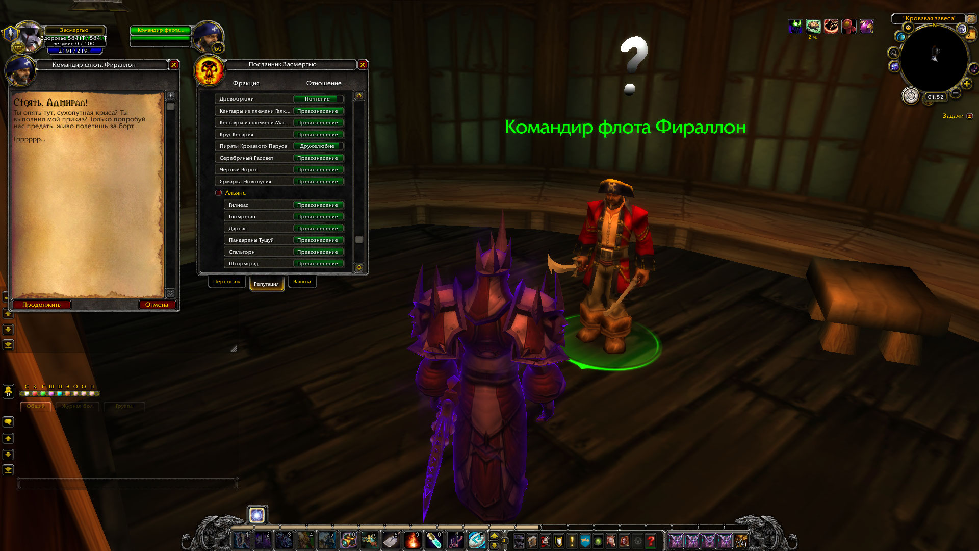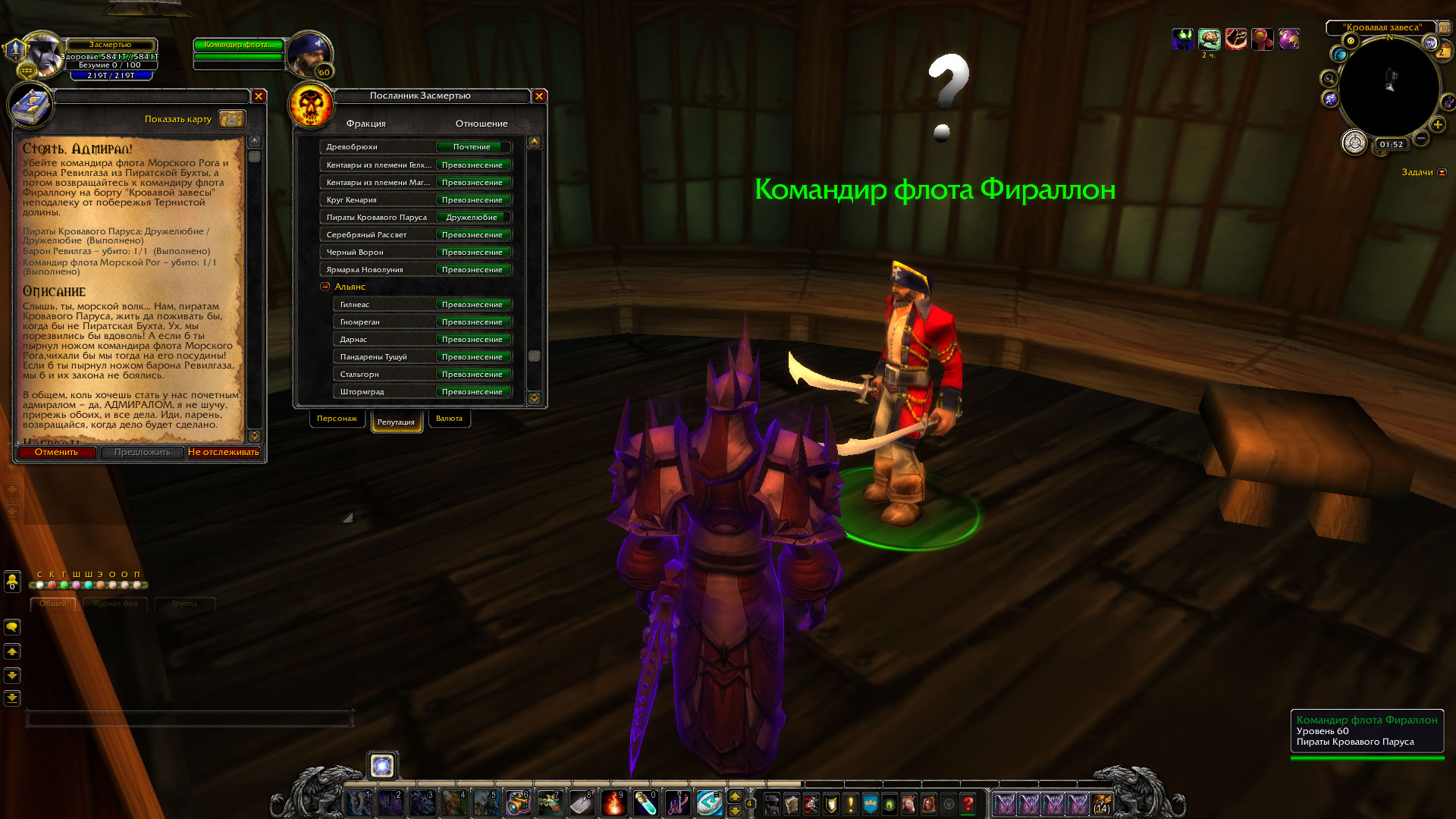На вовхеде ясно написано, что у квеста есть минимальные требования по репутациям: Пираты Кровавого Паруса (Дружелюбие) Пиратская Бухта (Ненависть) на скринах я не вижу выполненных условий. |
