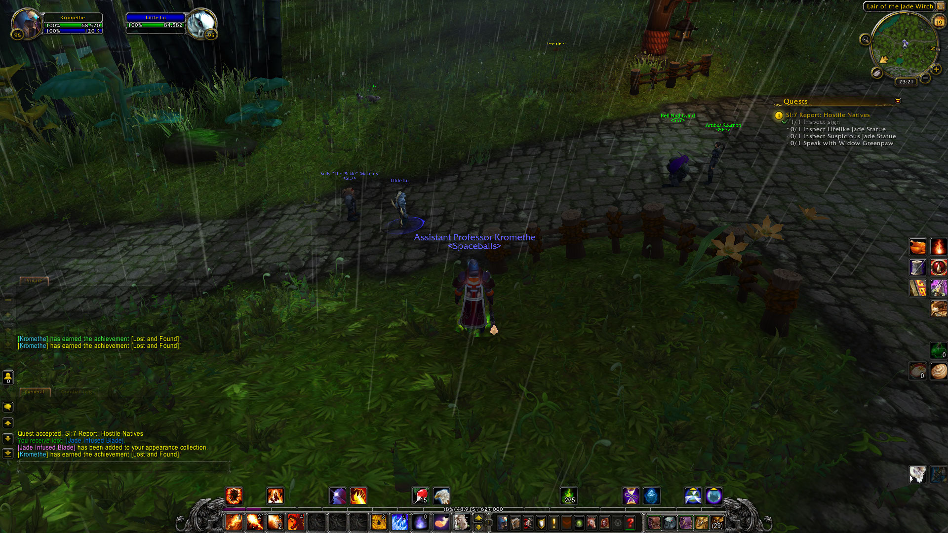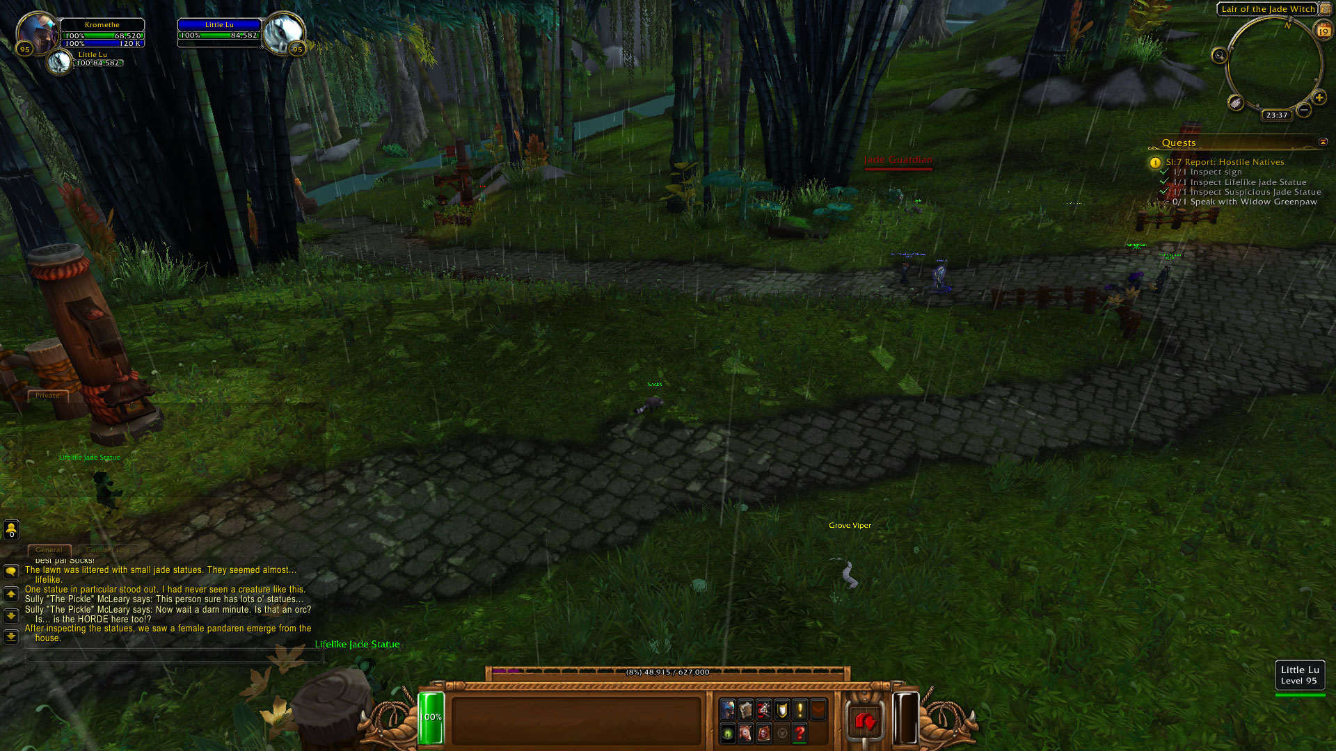 | Description | Our problematic quest is https://www.wowhead.com/quest=29726/si-7-report-hostile-natives where you need to play Little Lu. The problem is that after you accept the quest you are teleported on a specific location where you need to do 2-3 small tasks as Little Lu, well in our case not matter how many times I abandoned the quest never worked. Where I reached the location for quest Lu was stuck as NPC and I was walking around as my char. I managed to click on Inspect sign but when I went at statues, simply stopped working. Not to mention that if you abandon the Q you are not teleported back to the village where NPC is, you are simply abandoned in the middle of map. | ||||