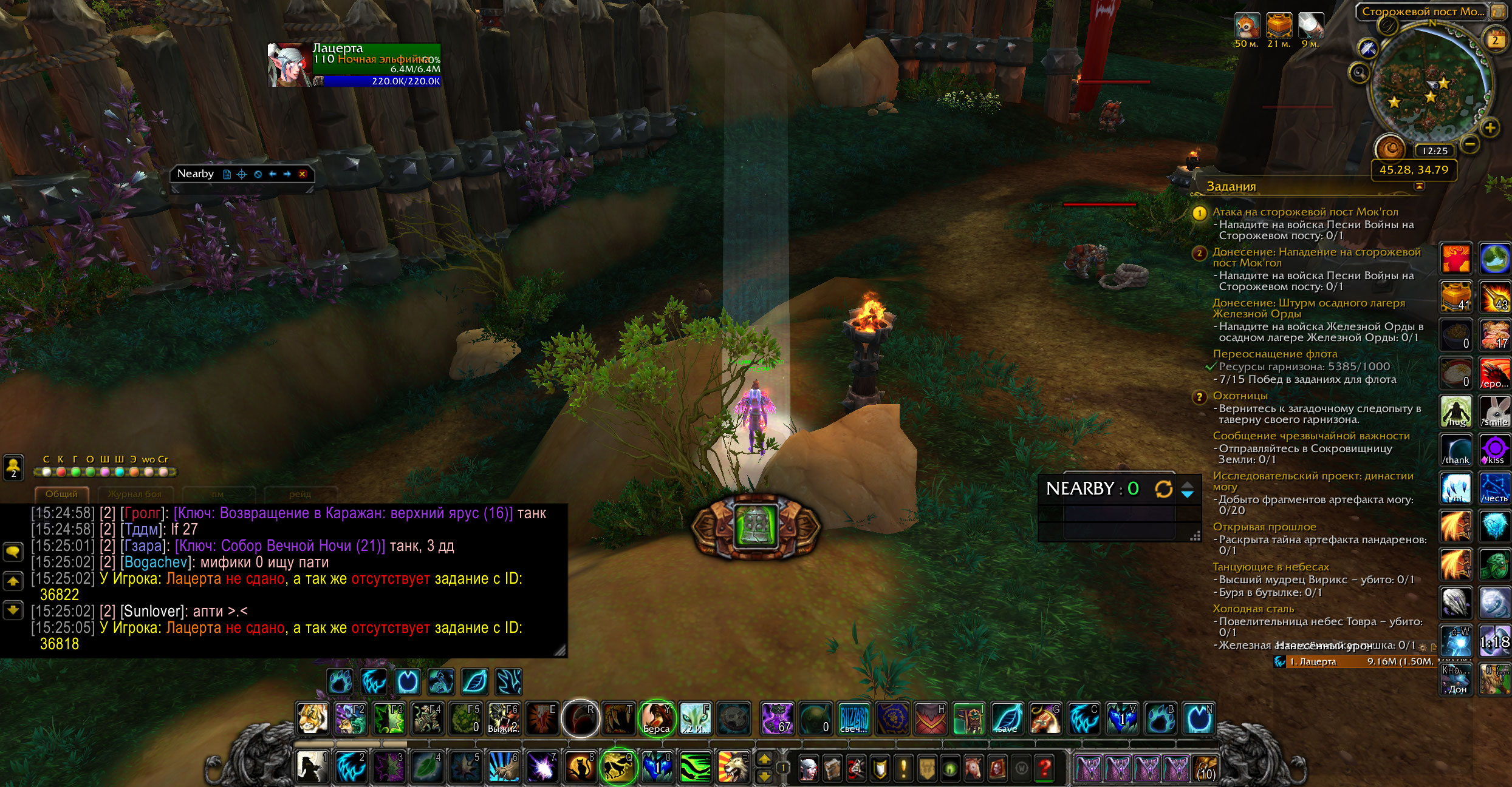 Почистила квест-лог, отменила все задания, кроме нужного. Вот, стою посреди локалки, задание взято, на миникарте область обозначена, но нет полосы процентов, засчитывающей килы мобов. С чем связан такой баг и что делать? WoWScrnShot_102423_172734.jpg (971,096 bytes) |