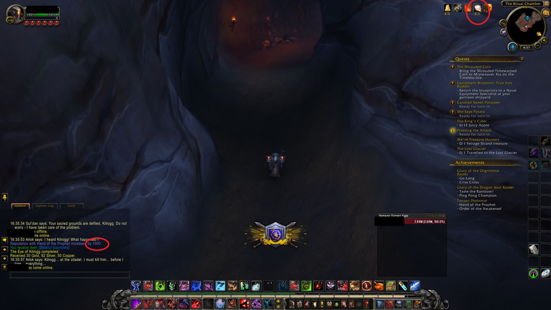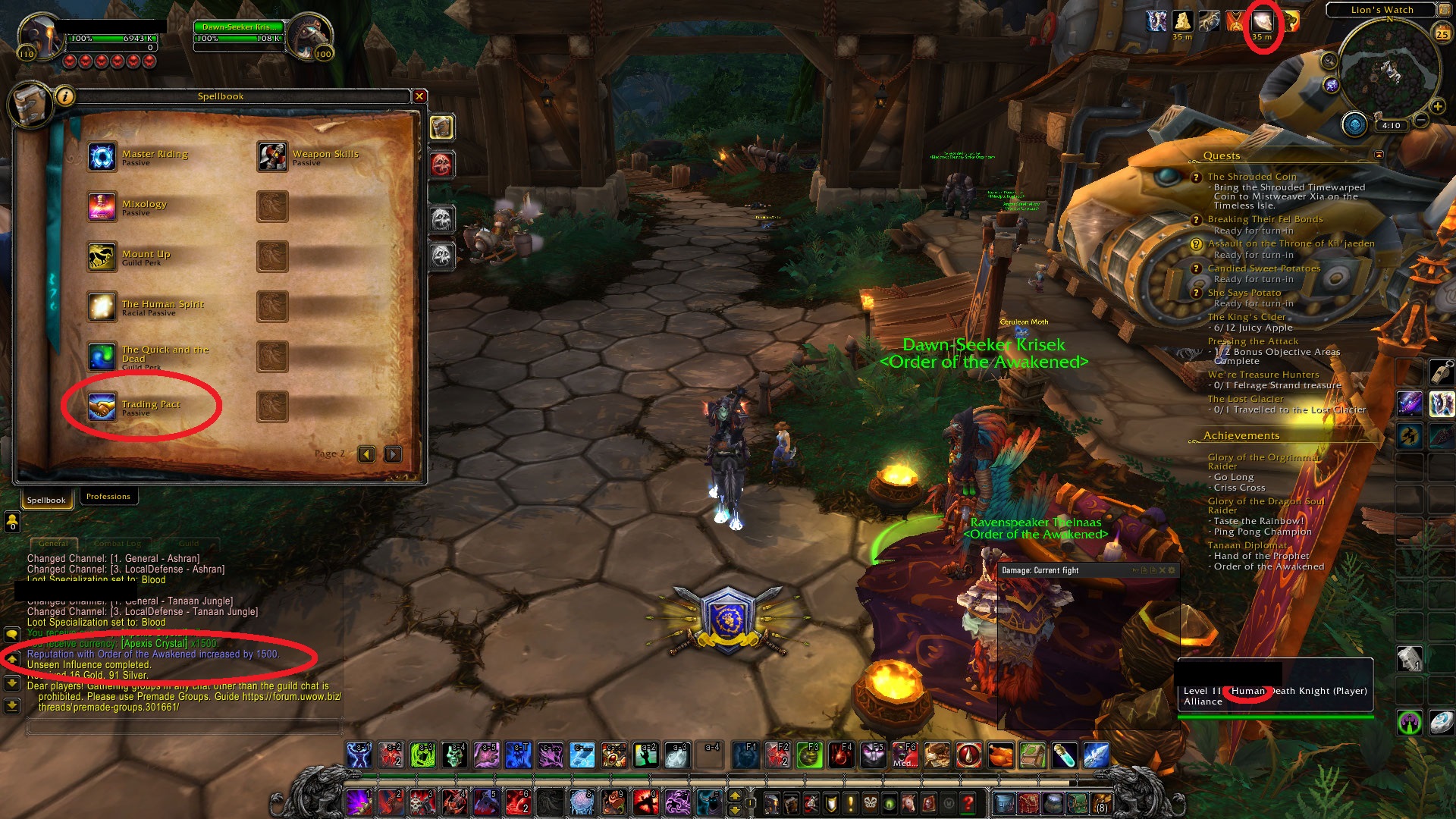 | Description | Only way to get Order of the Awakened rep apart from using the rare drop Legion of the Medallion is to do the daily https://www.wowhead.com/quest=39433/unseen-influence Reward is 1500 rep Rep reward isn't affected by human racial, level 3 trade posts, or seasonal buffs such as the Pilgrim's Bounty 'The Spirit of Sharing", which should be granting an extra 40% total for 2100 rep. As per attached image: Spirit of Sharing buff shown in top right with 35 minutes duration remaining highlighted Character race highlighted Trading Pact buff from level 3 Trading Post highlighted Quest reward only granting baseline 1500 rep highlighted | ||||