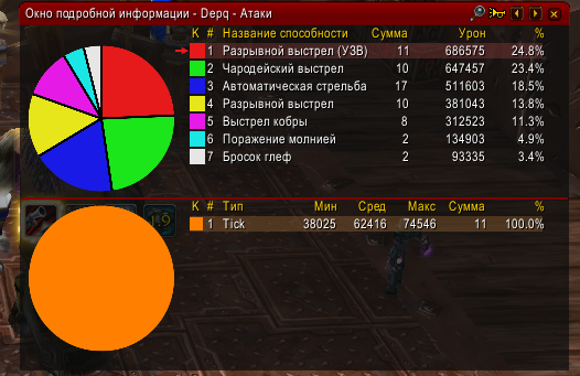 "Прошу обратить внимание на тик после второго разрывного" тут никакого бага у нас нет, по ролику с офы ниже, процесс суммирования урона у тиков запускается только после 3 прямого удара, пока аура 53301 поддерживается. У нас: https://www.youtube.com/watch?v=ADKO2_s_weM Третье попадание (прямой удар) проходит и запускается процесс суммирования (тики по 66634 единиц). Считаем: Берём урон последнего (третьего) прямого удара 49674 единицы и делим на 3 = 16558 единиц. Теперь берём урон тика после 2-го прямого удара 49905 и прибавляем 16558 = 66463 единицы, что сходится с уроном тиков в конце ролика. Как должно быть: Инфа от игрока тут немного запутанная, но после просмотра видео с офы ниже всё станет на свои места. https://www.mmo-champion.com/threads/1180957-Explosive-shot-still-clipping-on-PTR "Для вас: ES без крита = 5708 за тик. Первые 2 тика проходят нормально, потом обновляете ES - осталось 5708 урона. 5708/3 = 1902. Таким образом, к каждому такту вашего нового взрывного выстрела добавляется 1902 урона. 5708 + 1902 = 7610, это примерно то, что вы видите на этих скриншотах." https://www.youtube.com/watch?v=U5CiyEDgwtQ 0:49. Первый удар спелла на 8704 единиц и тик 9138 Второй удар спелла на 9041 единиц, тик 9077. Третий удар спелла на 9088 единиц и три тика на: 12105, 12104 и 12105 единиц (запустился процесс суммирования урона у тиков). Считаем: Берём третий прямой удар на 9088 единиц и делим его на 3 = 3029 единиц прибавится к каждому тику (после 3 прямого удара). А теперь берём тик после 2 прямого удара на 9077 единиц и прибавляем к нему 3029 и получаем = 12106 единиц урона за тик, что сходится с роликом. Пока что вижу у нас только один баг: Отсутствует 3 тик у ауры 53301 если мы её поддерживали. https://www.youtube.com/watch?v=ADKO2_s_weM Должен был быть третий тик на 66634 единиц урона, но его нет. Как должно быть: https://www.youtube.com/watch?v=U5CiyEDgwtQ 0:49. После 3 каста разрывного овнер перестаёт спамить и мы видим 3 тика разрывного на: 12105, 12104 и 12105. 1:09. А вот уже момент, где овнер также 3 раза кастит разрывной и не поддерживает время действия ауры 53301. В итоге мы видим по 2 тика у ауры 53301 и нет процесса суммирования урона у тиков после 3-го прямого удара. |