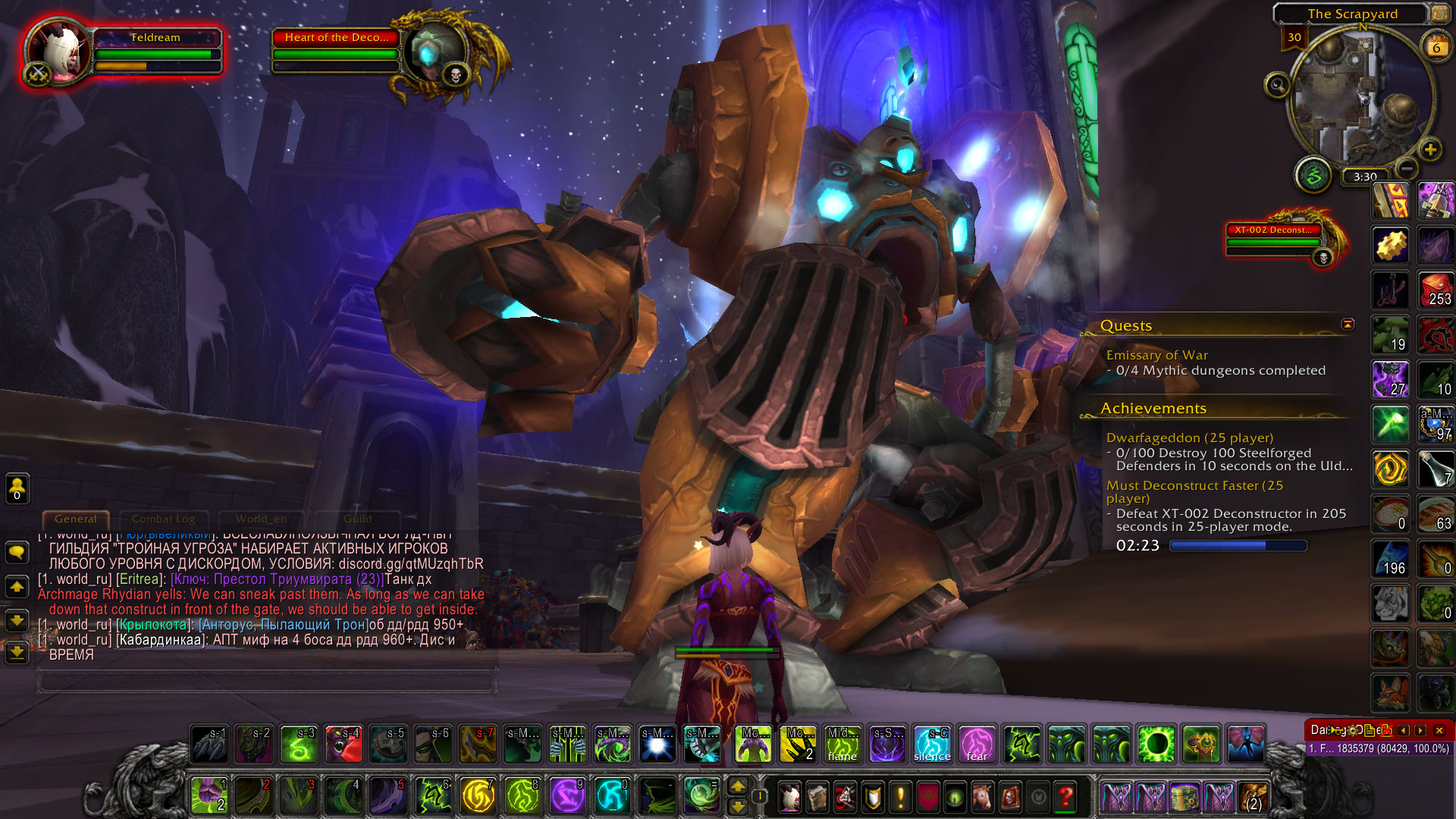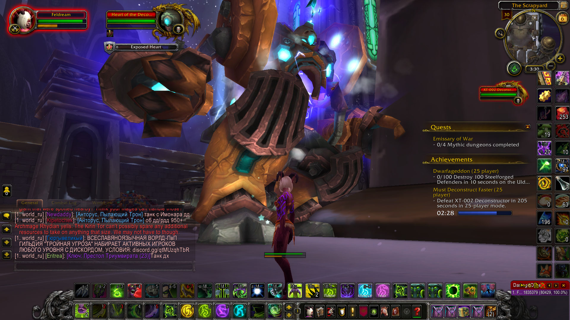 | Description | https://www.wowhead.com/achievement=12327/nerf-scrapbots still doesn't work after https://tracker.legionbugs.com/view.php?id=17875 - After triggering the 1st https://www.wowhead.com/npc=33329/heart-of-the-deconstructor and https://www.wowhead.com/spell=63849/exposed-heart at 75% HP and after 30 sec timer is over the boss doesn't retrieve his https://www.wowhead.com/spell=63849/exposed-heart back and just stay stuck. The only way to unstuck the boss is to kill his https://www.wowhead.com/npc=33329/heart-of-the-deconstructor but then he will NOT enter https://www.wowhead.com/spell=63849/exposed-heart phase again at 50% or 25% HP. - I noticed that https://www.wowhead.com/npc=33346/xe-321-boombot does only around 50% HP dmg to https://www.wowhead.com/npc=33343/xs-013-scrapbot and you will need more https://www.wowhead.com/npc=33346/xe-321-boombot that way. Official server seems that https://www.wowhead.com/npc=33346/xe-321-boombo does 100% dmg to https://www.wowhead.com/npc=33343/xs-013-scrapbot. | ||||
