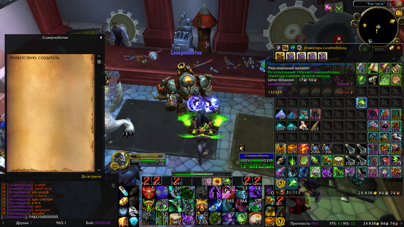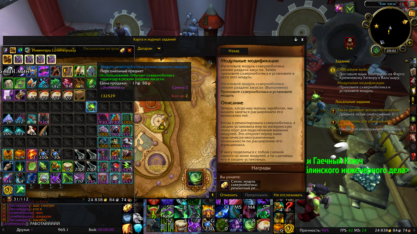 | Description | На скриншоте 166 первый этап по кв (выполнено), изготовить модуль скверноботика, он лежит в сумке. Следующий этап создать ботика из Батарейка скверноботика и призвать. На скриншоте 167 всё сделано и уже используется модуль на ботика, но ничего не происходит, модуль не пропадает и кв не расчитывается. Починка персонажа, отмена кв, повторный призыв ботика, повторный крафт модуля не привёл к успеху. | ||||