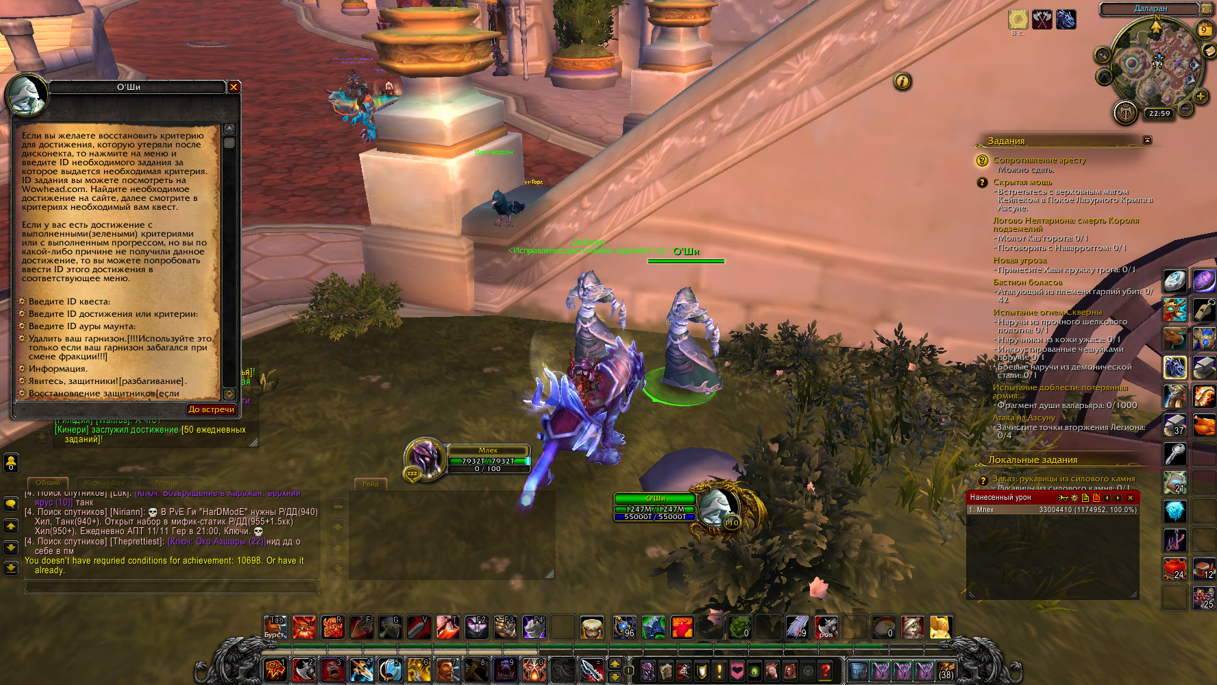 Попробуйте засчитать либо квест, либо само достижение у Оши в Даларане по их ID. Рядом с Де Багером. Отпишитесь по результату. Жду