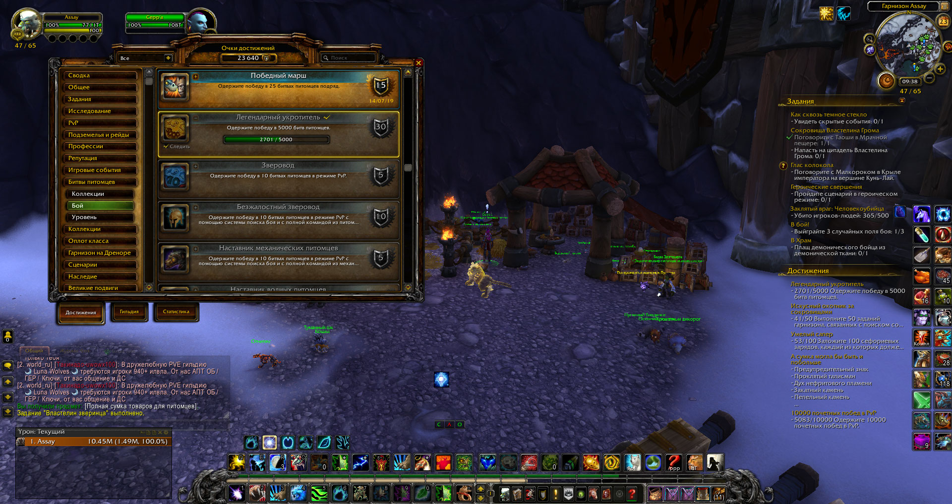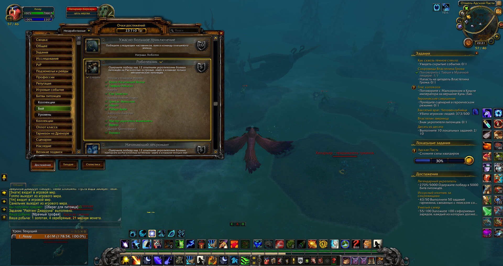 Играю одним персонажем уже с 2019 года, им же и делаю достижения. Заметила, что перестал работать счётчик при выполнении достижений с механическими питомцами. Убила Мракокрыла несколько раз и не засчитало. Примерно перед зимним ивентом 15 декабря. До этого засчитывалось и в гарнизоне, и дейлики в новом Даларане, и на Аргусе. Сейчас саму победу засчитывает, но в достижения не добавляются питомцы, что убиты, и счетчик не меняется. Пробовала и другими составами питомцев - та же картина. |