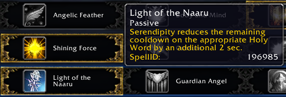 | Summary | 0028561: Holy Priest, Serendipity (63733) && Apotheoisis (200183) && Light of the Naaru (196985) | ||||