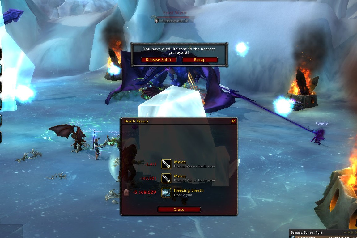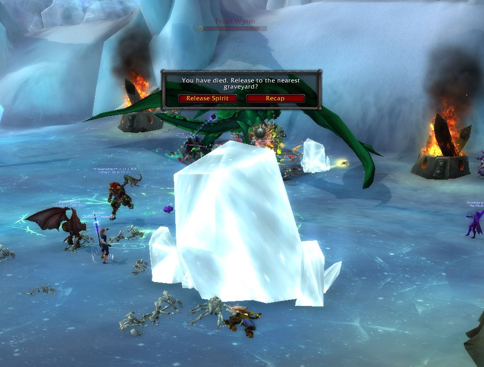 Attached images, died to frost breath cone despite being behind ice block after poor tanking turned the drake towards the raid. |