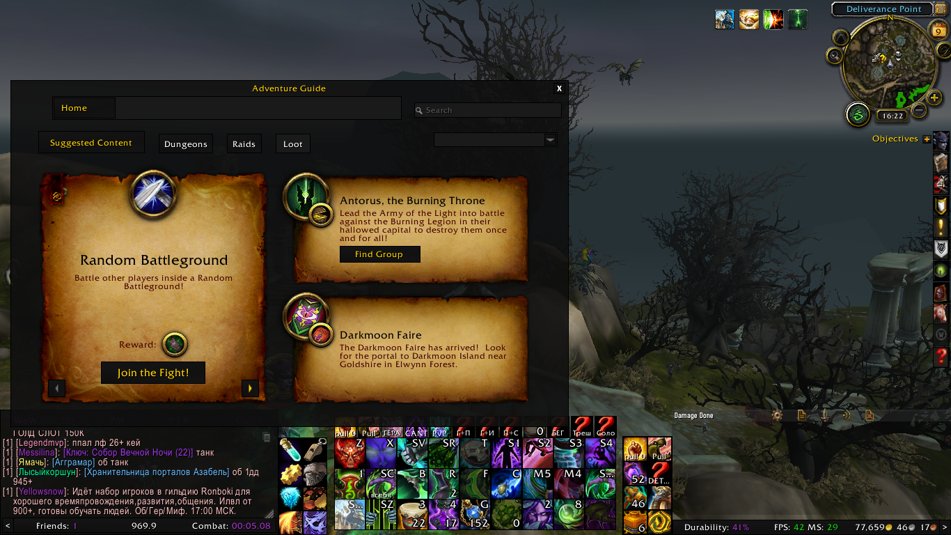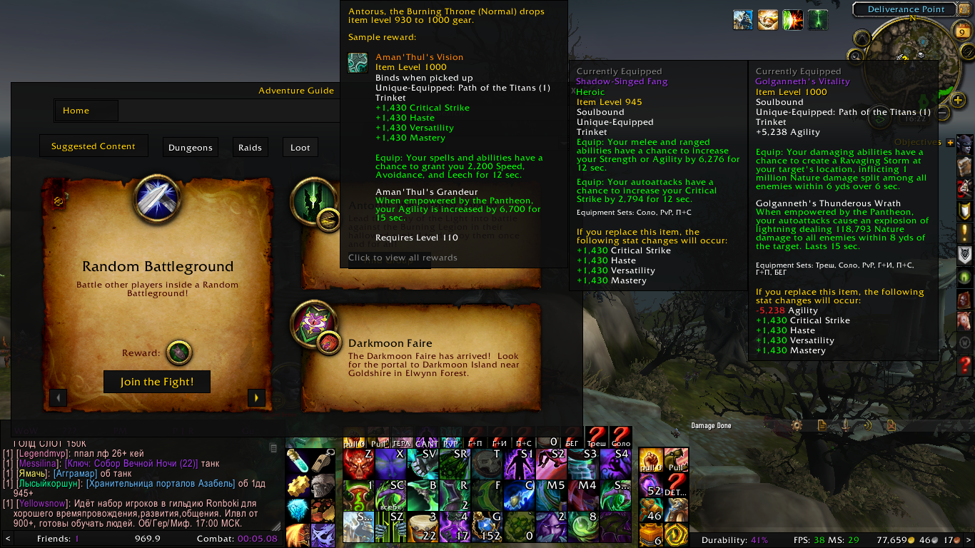 | Description | Реалм х100 Легион На скриншоте 169 переходя во вкладку Предлагаемый контент как обычно показывает различные события и награды за них. На скриншоте 170 показан предполагаемый лут за прохождение Апт (Обычный), в этой раз показывает Амантул, в остальные дни лут меняется. Вопрос следующий, если в описании пишет Апт (обычный), почему нам следует найти группу, ведь если проходить рейд через группу то режим будет Поиск рейда (лфр), или же я не правильно понимаю и оно просто предлагает собрать рейд через вкладку, такую как: Заранее собранные группы? Или же это просто визуальные награды которые никак образом не выдаются, хотелось бы объяснения, т.к вопрос терзает довольно давно. | ||||