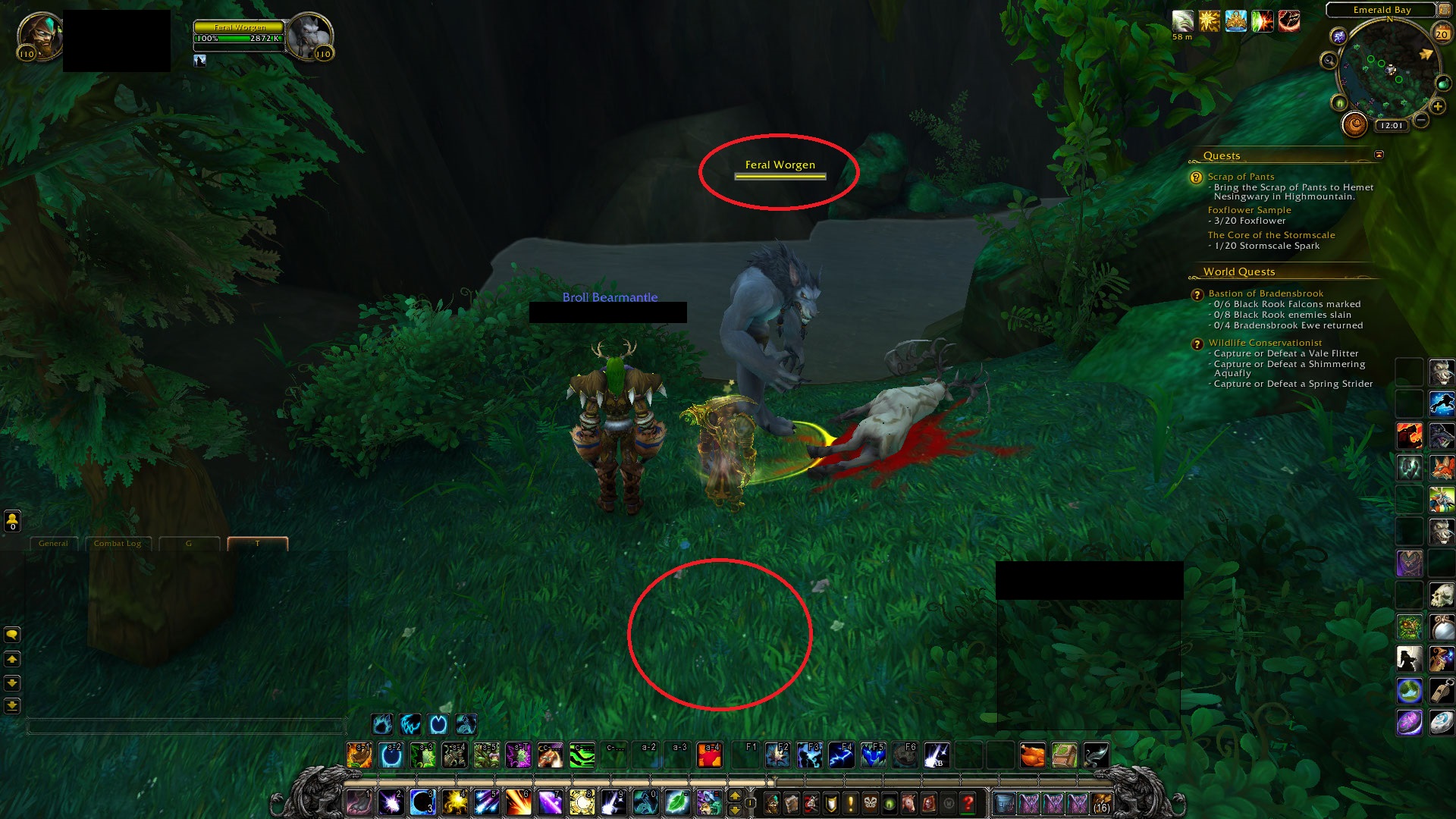 | Additional Information | There are several distinct Feral Worgen npcs in VS https://www.wowhead.com/search?q=feral+worgen Attached image: Feral Worgen npc Missing button for spell effect to cure npc От тестера: spell id: 224579 spell id: 224133 npc id: 112612 npc id: 112618 Map: 1220 (Broken Isles) Zone: 7558 (Val'sharah) Area: 7746 (Ash'theran) WMOAreaId: 77432 Phase: 1 X: 3605.9116 Y: 5816.2075 Z: 318.72543 Orientation: 4.172849 grid[38,42]cell[6,7] InstanceID: 7558 ZoneX: 68.779594 ZoneY: 36.991627 GroundZ: 318.71875 FloorZ: 318.72437 Have height data (Map: 1 VMap: 1) Current Zone: 7558 (Val'sharah) Area: 7746 (Ash'theran) Difficulty 0 spawnmask 0 vmapZ 318.72437 GetPositionH 0 GetPositionZH 318.72543 TileX 25 TileY 21 На воргенов которые находятся под аурой(224133) можно использовать спелл (224579), и диспельнуть воргена от этой ауры, что-бы получить за это силу артефакта, это особенность Косы Элуны которая У нас же когда подходишь к воргену не появляется кнопка-спелл, для того что-бы взаимодествовать с воргеном | ||||