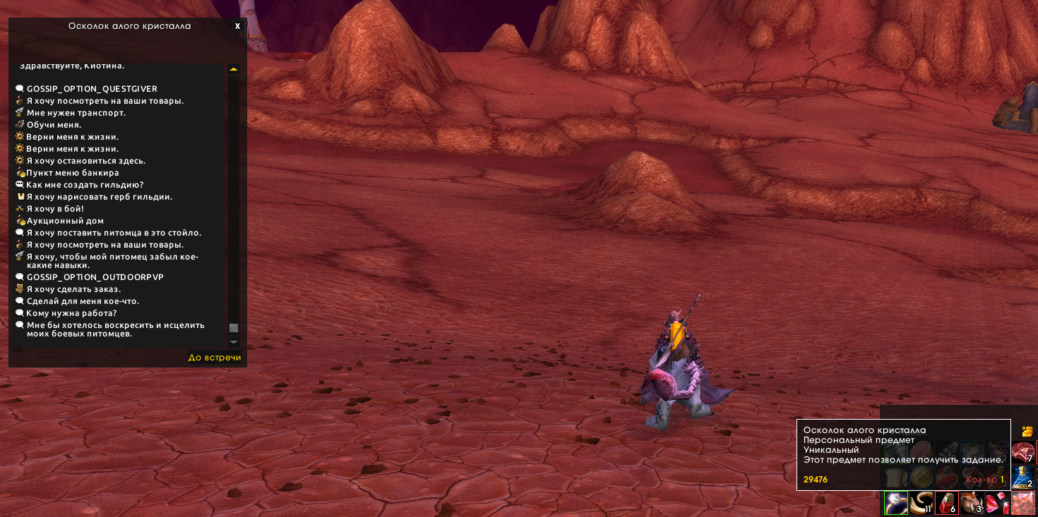 | Description | Осколок алого кристалла(29476) выпадает с Гневного колоса (Полуостров адского пламени) Итем выдает квест. + выскакивает окно с различными функциями вспомогательных НПС. Но кнопки в окне не реагируют. | ||||
