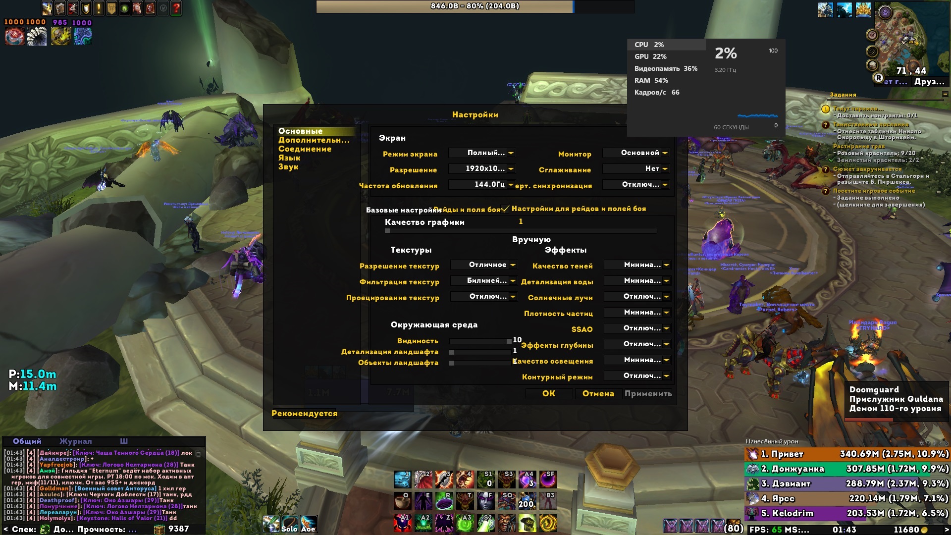 | Description | В обычном мире 150-250 фпс, в анторусе и даларане 50 фпс. Процессор не загружается, скриншот прилагаю. Просьба дать рекомендации по поднятию фпс, повышения нагрузки на комплектующие. Операционная система Windows 11 Процессор AMD Ryzen 7 5800H Оперативная память 16 ГБ Тип памяти DDR4 Частота памяти 3200 МГц Частота обновления экрана 144 Гц Видеокарта NVIDIA GeForce RTX 3050 Объем видеопамяти 4 ГБ Общий объем накопителей SSD 512 ГБ | ||||