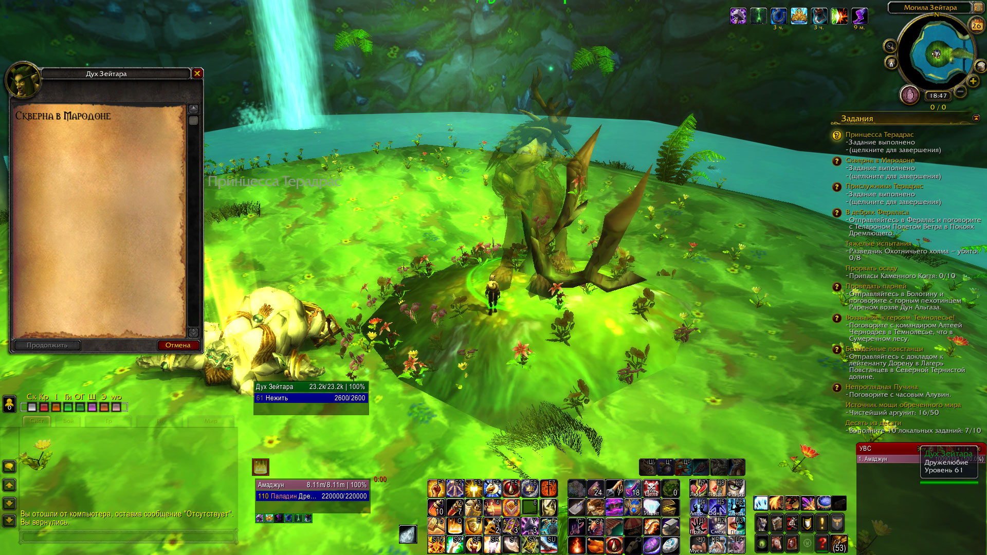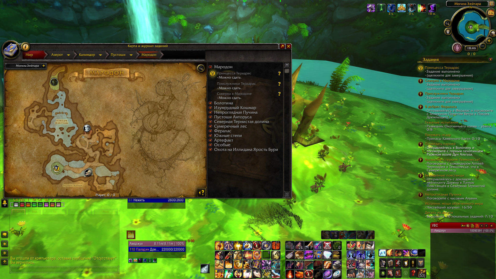 | Description | Невозможно завершить задания в Мародоне, так как кнопки завершения неактивны. При выходе из подземелья или перезаходе в игру задания сбрасывают статус с завершённых на невыполненные. 1.Прислужники Терадрас https://www.wowhead.com/ru/quest=27698/%D0%BF%D1%80%D0%B8%D1%81%D0%BB%D1%83%D0%B6%D0%BD%D0%B8%D0%BA%D0%B8-%D1%82%D0%B5%D1%80%D0%B0%D0%B4%D1%80%D0%B0%D1%81 2.Скверна в Мародоне https://www.wowhead.com/ru/quest=27697/%D1%81%D0%BA%D0%B2%D0%B5%D1%80%D0%BD%D0%B0-%D0%B2-%D0%BC%D0%B0%D1%80%D0%BE%D0%B4%D0%BE%D0%BD%D0%B5 3.Принцесса Терадрас https://www.wowhead.com/ru/quest=27692/%D0%BF%D1%80%D0%B8%D0%BD%D1%86%D0%B5%D1%81%D1%81%D0%B0-%D1%82%D0%B5%D1%80%D0%B0%D0%B4%D1%80%D0%B0%D1%81 | ||||