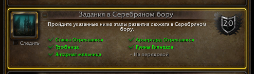 | Description | Не могу получить квест у Сильваны, хотя он отображается на карте как доступный к получению. В локации Передовая Отрекшихся при этом две Сильваны - одна на посту, другая у ямы с валькириями. Ни у одной из них квеста нет. Квест влияет на достижение "Задания в Серебряном бору". Легион х1. | ||||