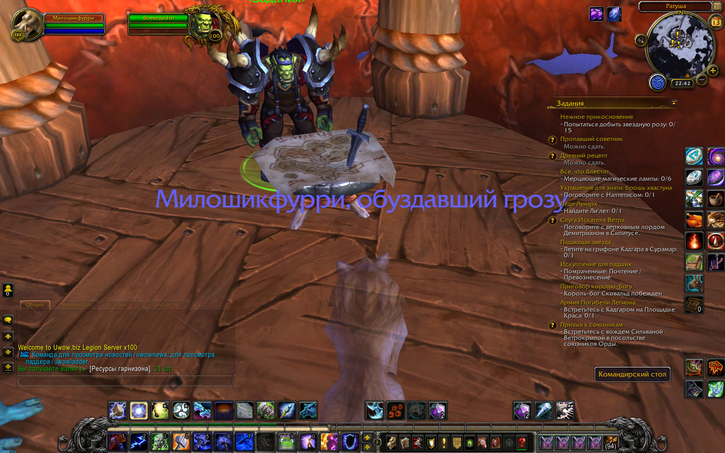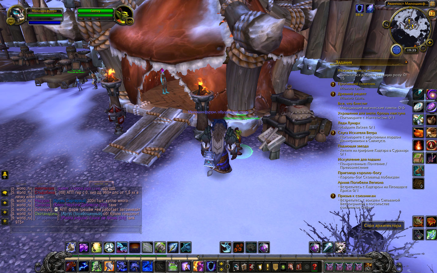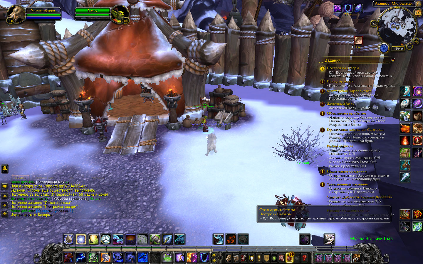 Задания Ранее не требовалось в базе данных не обнаружено Если у вас были проблемы со столом архитектора и командирским столом, возможно у вас были проблемы с игровым клиентом, в данной ситуации вам необходимо было удалить файл Chache, а если в будущем столкнётесь с проблемой невозможности взаимодействовать со столом архитектора, для этого необходимо изучить https://www.wowhead.com/ru/item=111956/казармы-уровень-1 и только после этого стол архитектора станет активен в вашем гарнизоне. Приятной игры, я рад что проблема решилась |