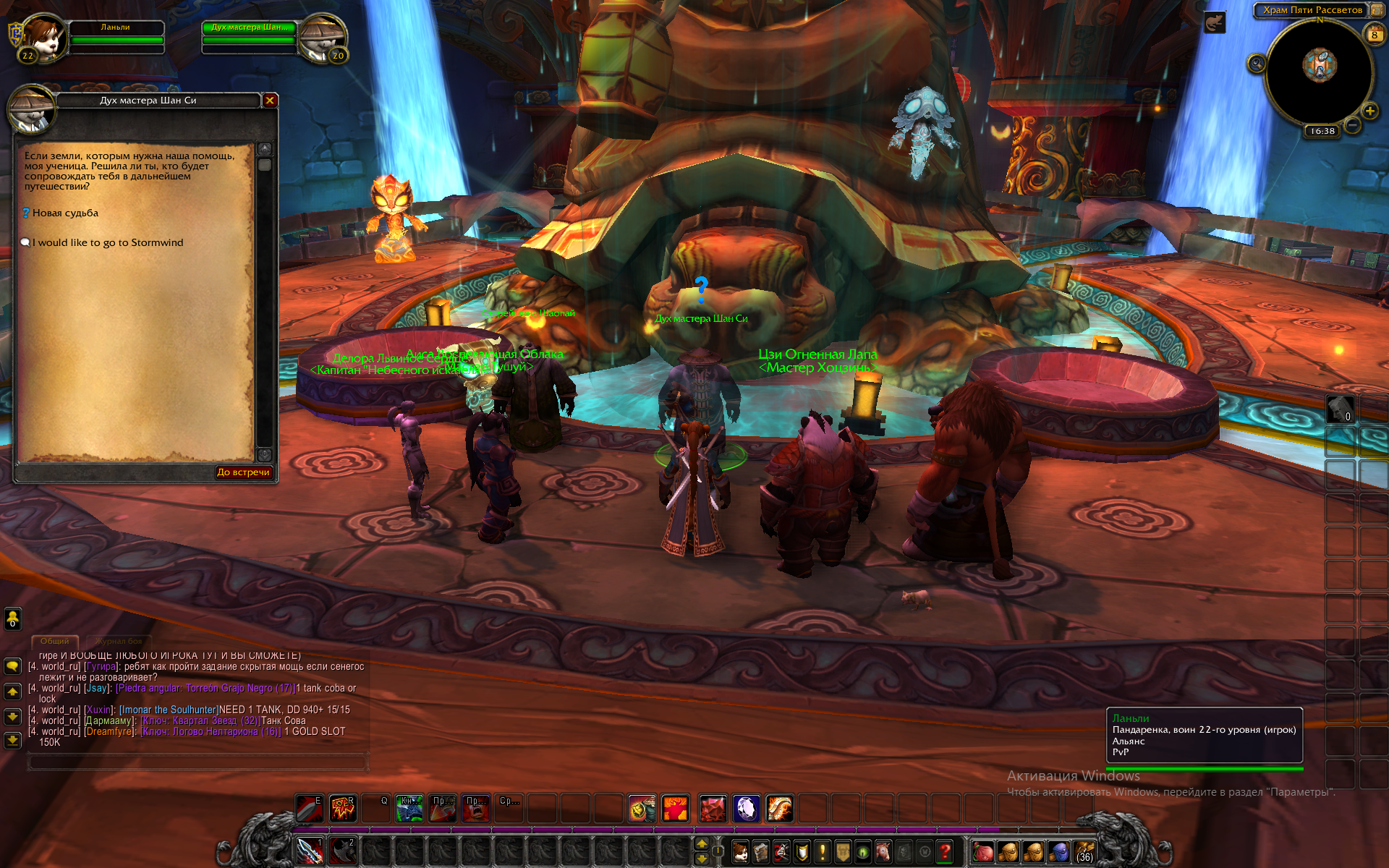 | Description | Квест Новая судьба в Храме пяти рассветов. После выбора фракции персонажа перенесло к воротам Штормграда. Потом выкинуло с сервера, и не получалось вернуться в игру около получаса, не пускало на сервер. Когда удалось попасть в игру, персонаж оказался снова в Храме пяти рассветов. При этом на иконке персонажа написано, что он принадлежит альянсу. В диалоговом окне, при нажатии на возможность вернуться в штормград, ничего не происходит. | ||||