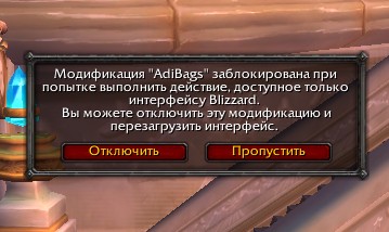 | Description | при регистрации на боля боя или арену, выбивает надпись ..Модификация "AdiBags" заблокирована при попытке выполнить действие, доступное только интерфейсу Blizzard. Вы можете отключить эту модификацию и перезагрузить интерфейс.. если я выключаю аддон то оно пишет тоже самое только с другим аддоном ,и ничего не помогает ... | ||||