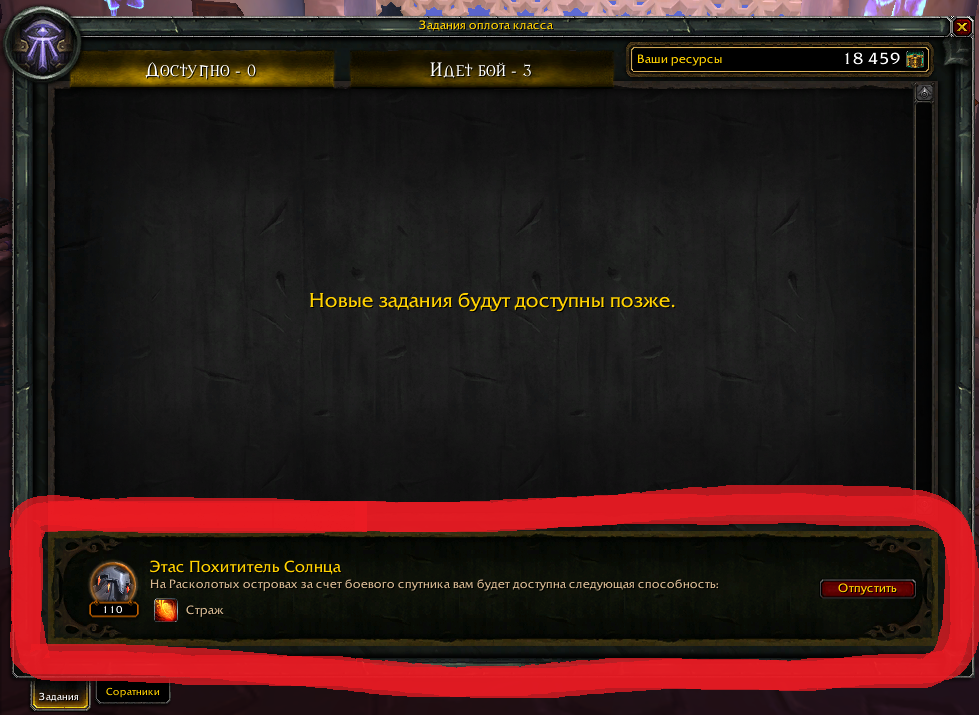 Сейчас пробовал заходить на разных персонажей и к моему удивлению на одном из них кнопка "отпустить" сработала и это класс разбойник и охотник, у меня на них 6 из 6 защитников из них 4 соратника которых могу выбрать в качестве боевого спутника, пробовал выбирал всех доступных и они "отпускаются" без проблем, а вот на классах персонажа Маг, Воин, Жрец, Лок, Охотник на демонов "отпустить" соратников не получается, они проще сказать забагались и использовать в дальнейших заданиях никак нельзя ( это очень огорчает. |