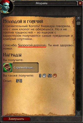 | Steps To Reproduce | 1. Взять квест https://www.wowhead.com/ru/quest=24626/молодой-и-горячий у https://www.wowhead.com/ru/npc=37969/киджара. 2. Выполнить квест. 3. Сдать квест https://www.wowhead.com/ru/npc=38005/морайа. | ||||